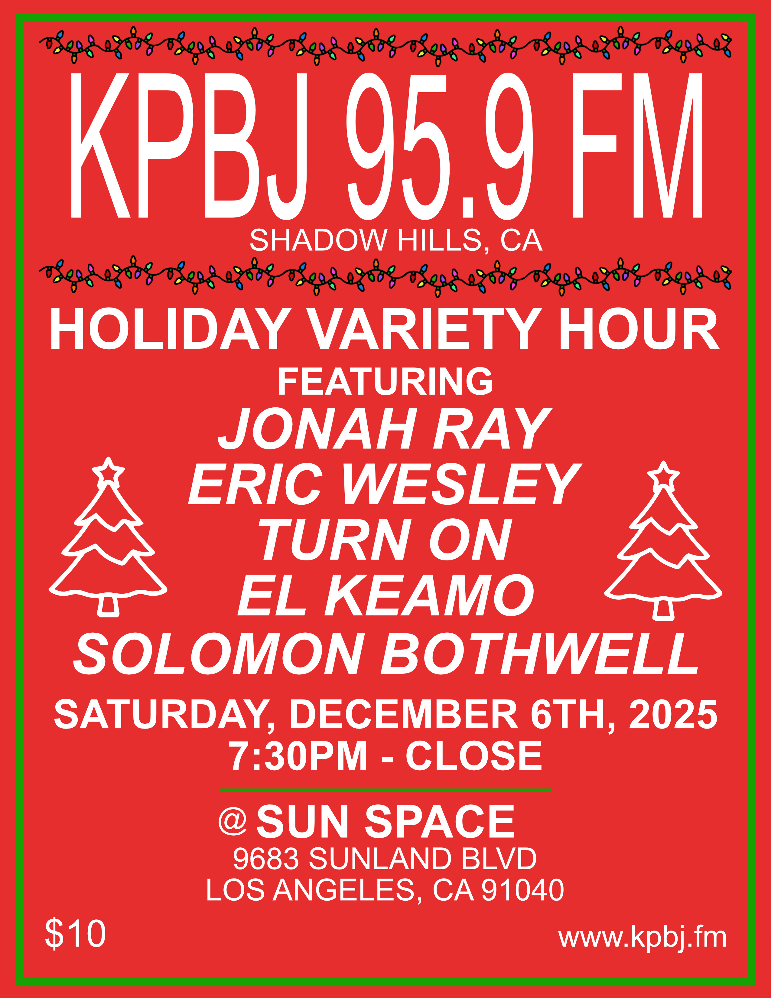 Join us for a holiday fundraiser and variety show to help us launch the station. KPBJ is free form community radio station in Shadow Hills.