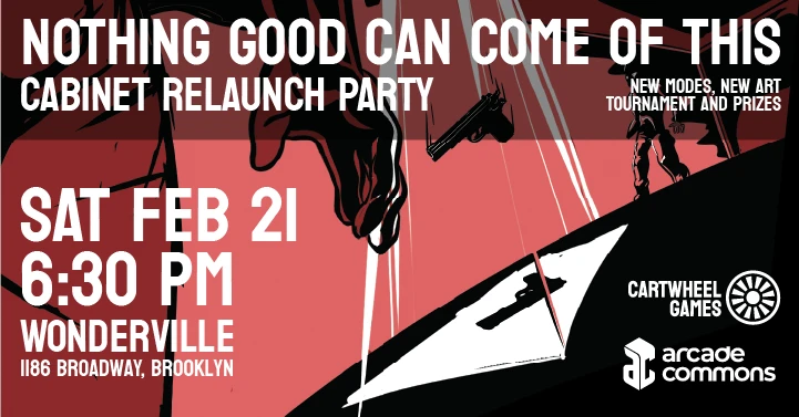 The classic "Nothing Good Can Come Of This" arcade machine has had a complete makeover! We are celebrating the upgraded hardware and newly created side-art by Chris Hernandez with a tournament. Free drinks to the winner! Nothing Good is a fast-paced minimalist fighting game in which two players duke it out for control of a deadly weapon.