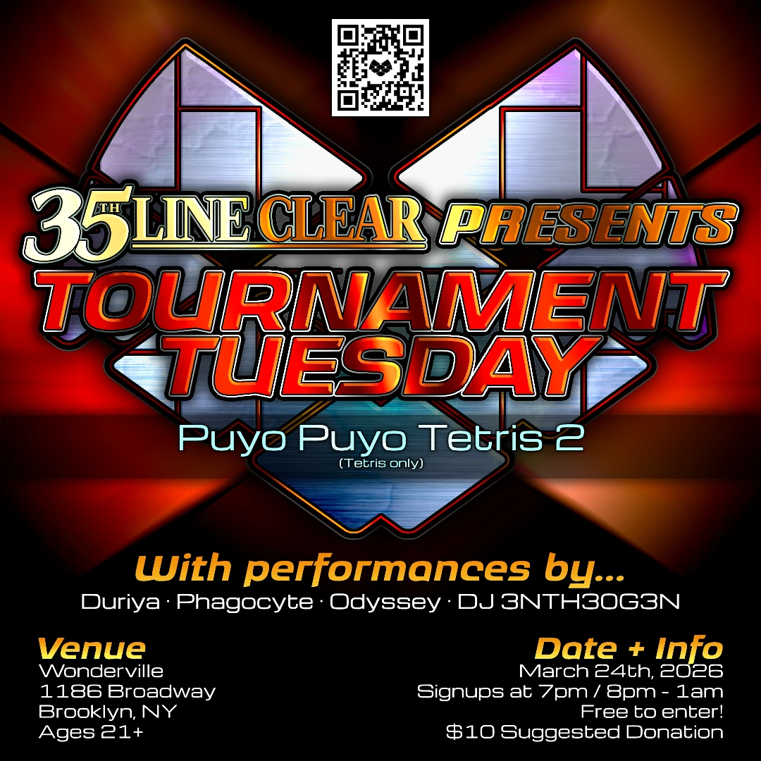 35th Line Clear takes over Tournament Tuesday for a game of Puyo Puyo Tetris 2! Come join us for a fun and free tournament of Tetris, hosted by Wren with a cast of DJs curated by @seed_simulator!