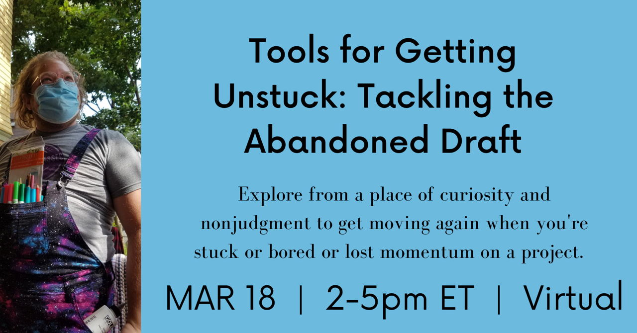 Bring a few half-finished pieces or art that you aren't satisfied with and we'll work together through various strategies for unblocking. We'll examine multiple perspectives as we go to best get at the root causes- I lost motivation, I got distracted, I got scared, I got overwhelmed, I forgot where I was in the process, etc et