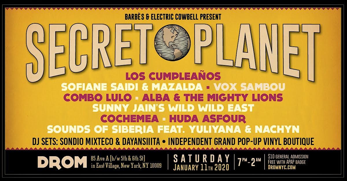 Over the years, Secret Planet has presented close to 80 different groups, including Chicano Batman, Combo Chimbita, Hailu Mergia, Janka Nabai, No BS Brass Band, Flor de Toloache, Las Cafeteras, Alash, Anbessa Orchestra, Innov Gnawa, Chicha Libre, Slavic Soul Party, Ladama, Underground System, The Debo Band, Alsarah & the Nubatones, BCUC, Mdou Moctar, Yonatan Gat and quite a few more.