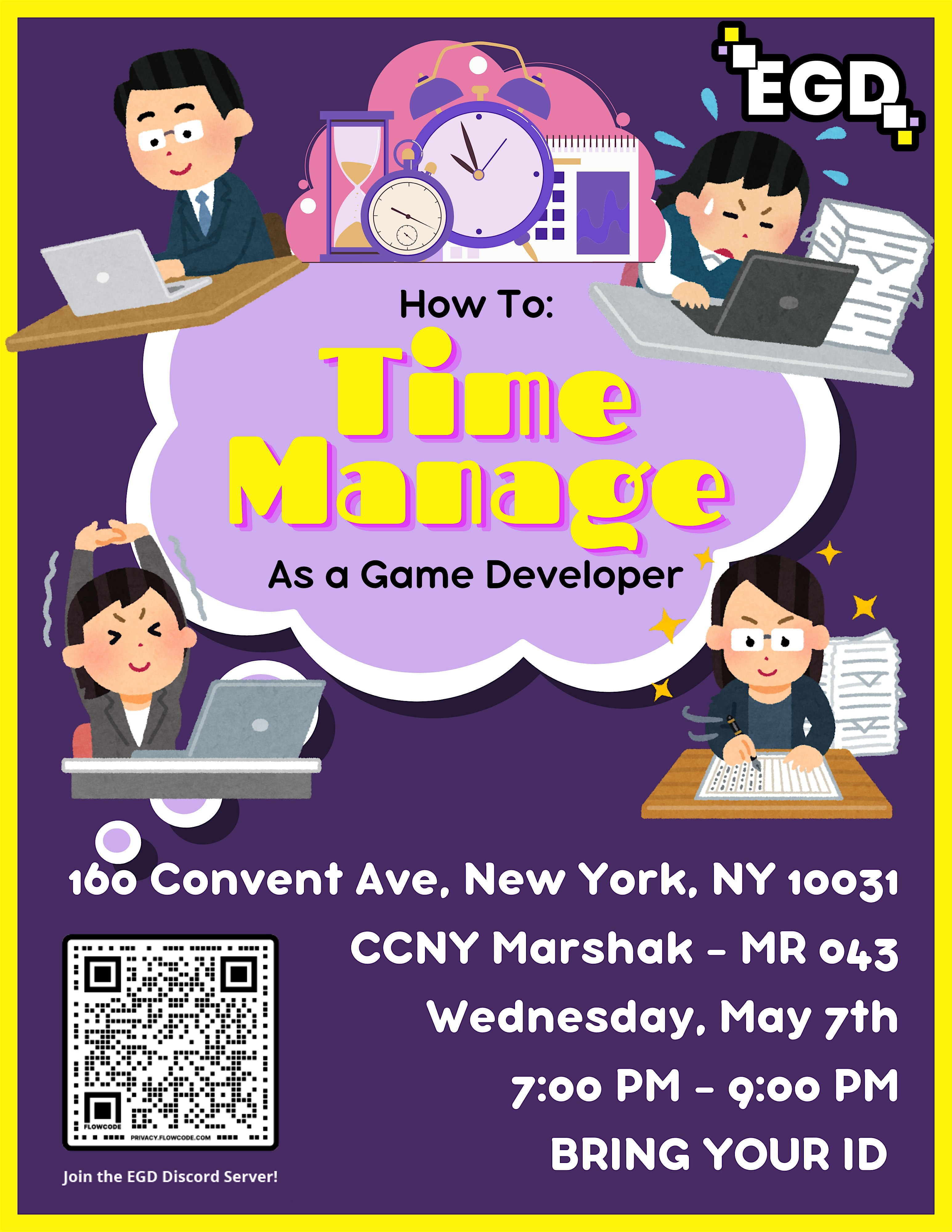 Struggling to balance school, work, and game development? You’re not alone! Join us for a session on time management tailored for aspiring game devs juggling busy schedules. This in-person event will take place on Wednesday, May 7th, 2025, from 7-9 PM in City College's Marshak Science Building in room MR043. Share experiences, pick up helpful tips, and learn how to build a workflow that keeps you moving toward your goals—without burning out.