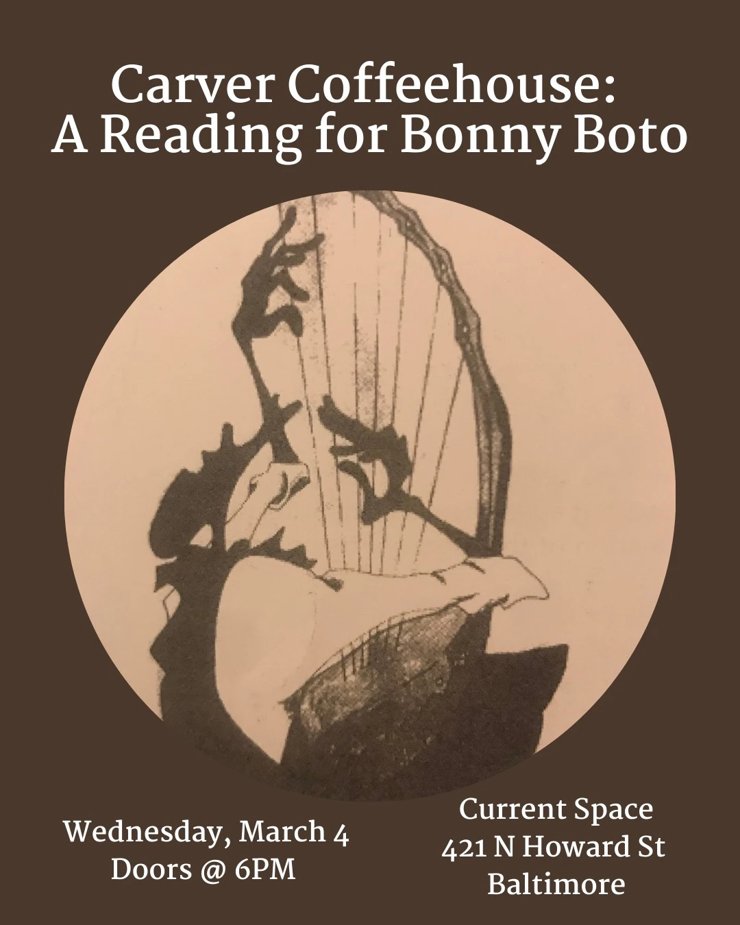 Please join alumni writers from Carver Center's Literary Arts program, as we gather for a reading to memorialize our creative writing teacher, Bonny Boto. Bonny was the Literary Arts Chair at Carver for more than a decade. After her retirement from teaching, she was the Vice President of the Ochan Self-Help Alliance in Uganda. She was devoted to women's health, social justice, and to each and every student who passed through her classroom. She single-handedly designed and ran this comprehensive, free, four-year writing program, which helped emerging writers discover their voice and lay the foundation for lifelong practice. Her former students want to honor that ongoing practice, and Bonny's memory, through this evening--shaped after the Coffeehouse events which Bonny loved so much.