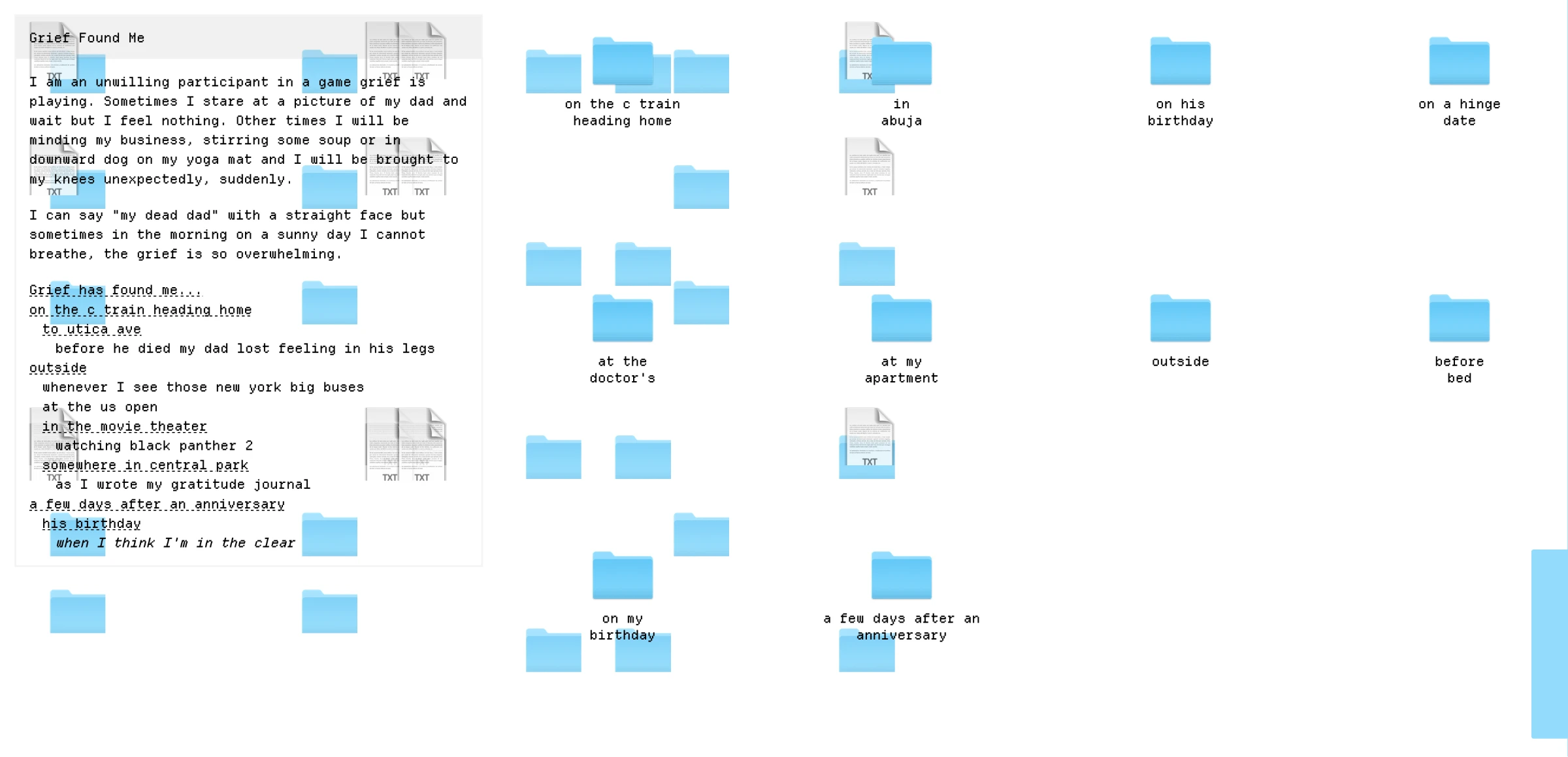 In this workshop, we will do a close-read of poems to look for computational openings: places where the poem may invite interaction/touch, where it could move or grow, where it could curl up, places that map to the possibilities inherent in computation. From there, we will build our own computational poems using HTML, CSS and JavaScript. Read more on our