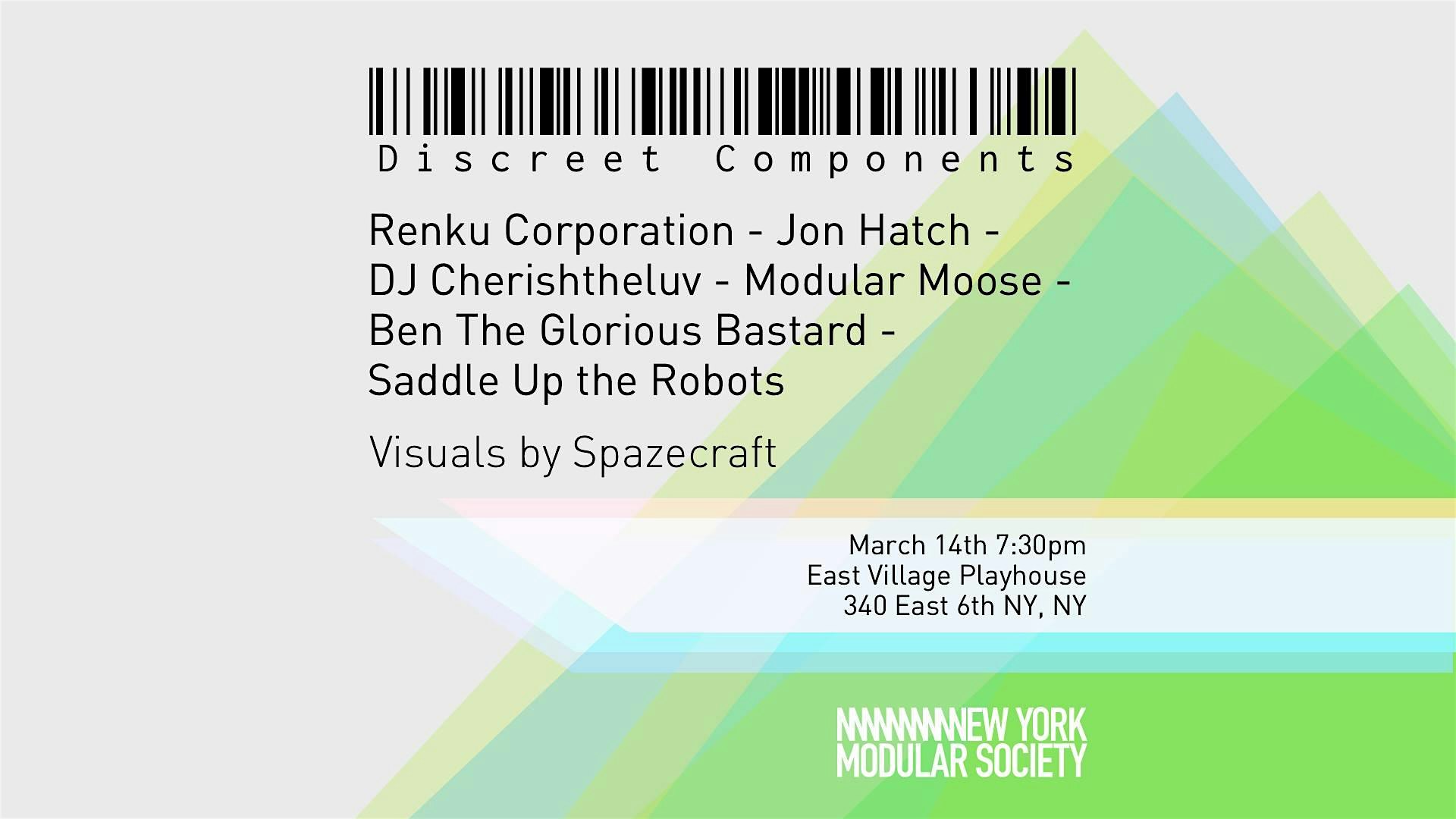 Discreet Components is a live ambient music modular synth series, presented by New York Modular Society. This premier show features the talent of:Renku Corporation - Jon Hatch - DJ Cherishtheluv - Modular Moose - Ben The Glorious Bastard - Saddle Up the Robots** Seating and tickets are limited to 25 **** Drinks are included in cost **** $15 Advance Tickets Only **** NO tickets at the door **