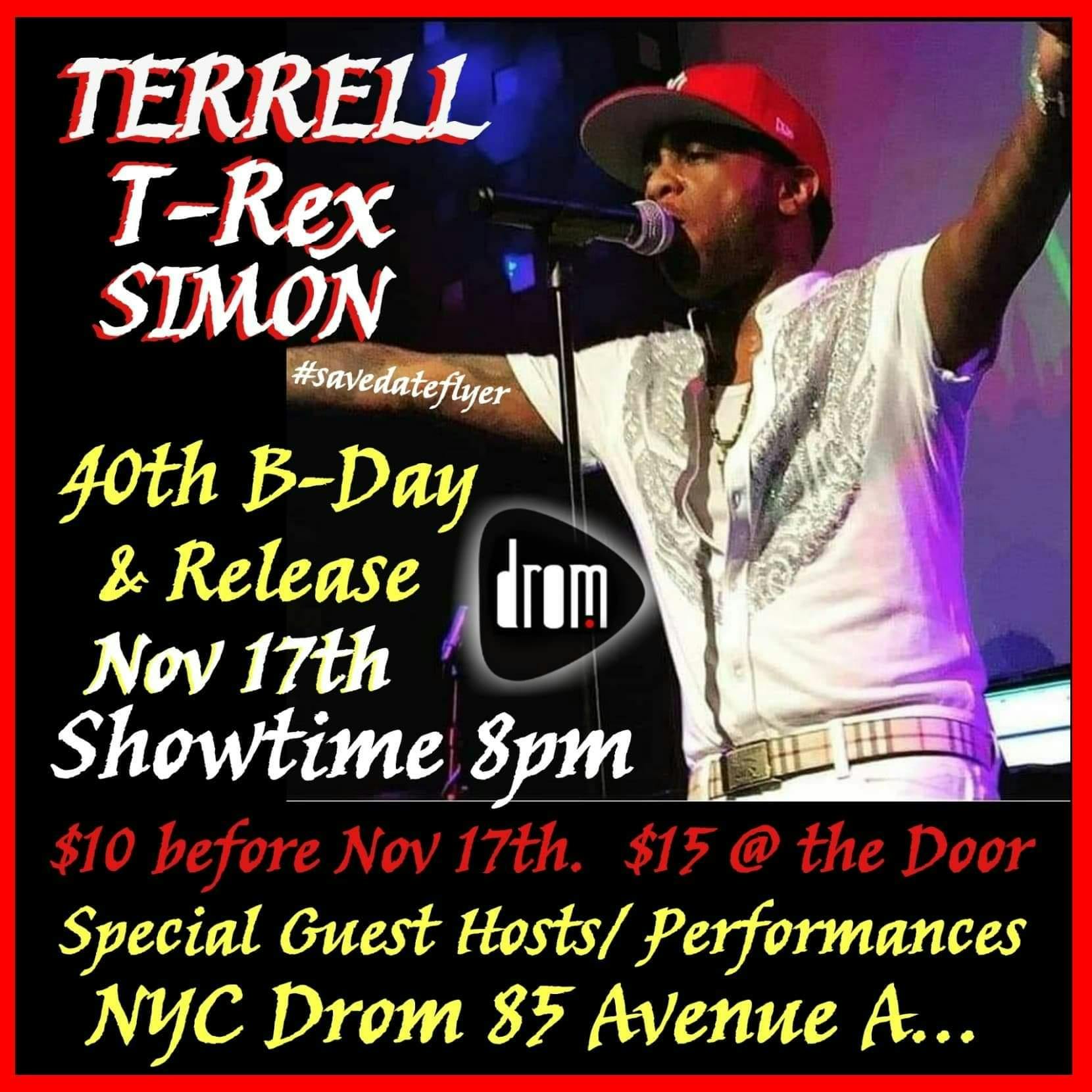 Terrell T-Rex Simon's 40th Birthday & Release at DROM in the East Village, NYC on Sunday, November 17th!
