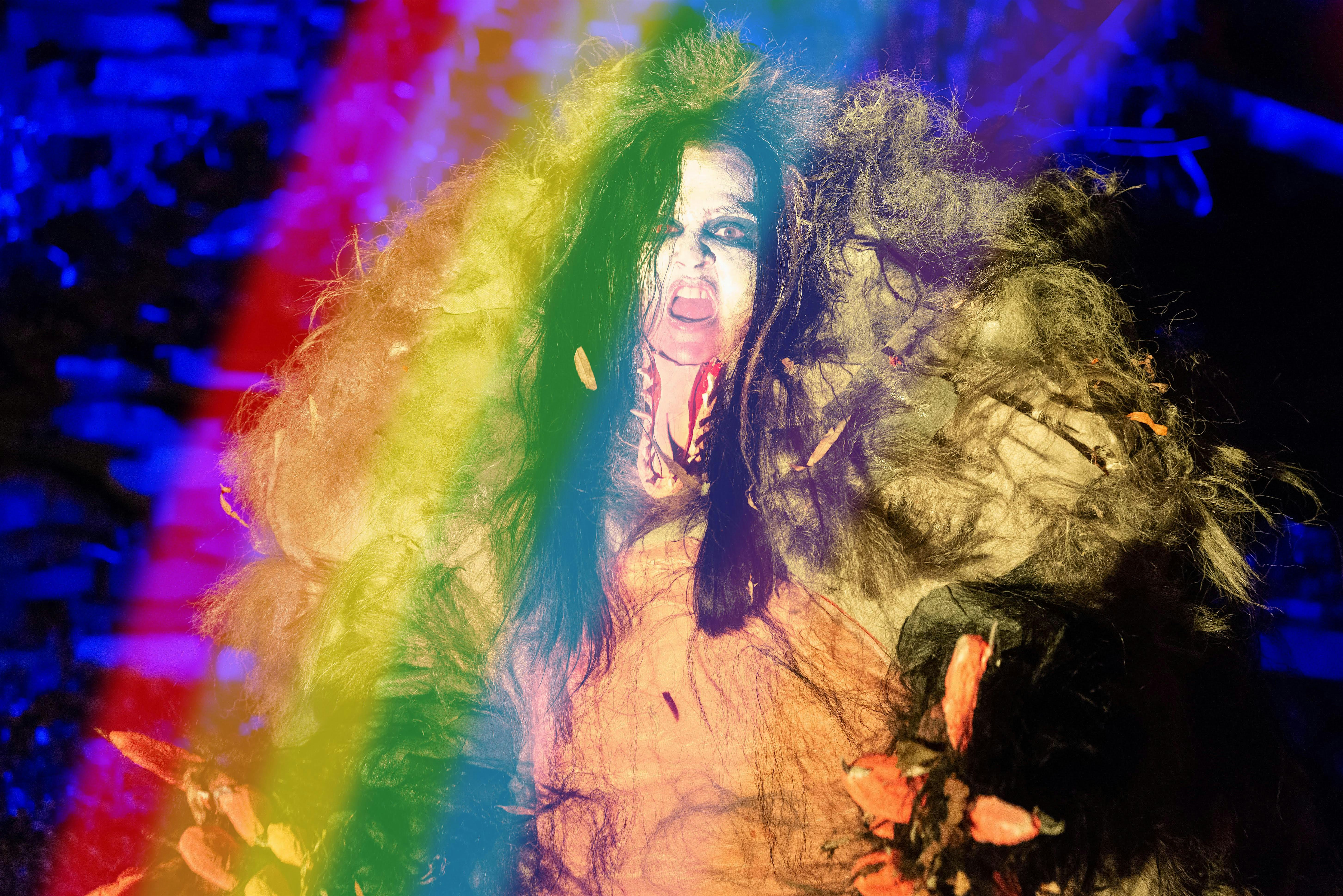 Resembling a high school musical backdrop, a vintage Disney ride, or the campy gore of a community-built haunted house, THE MIRACLE is a DIY, oversized supernatural set for performance made up of animatronics, costumes, and special effects. It references iconic horror movies such as A Nightmare on Elm Street (1984), B-movie camp extravaganzas, drag theater, and musical comedies. A large forest recalls The Swamps of Sadness from The NeverEnding Story (1984), while an oversized bedroom, modeled after Rhonda Shears’ late-night, cult classic USA Up All Night (1989-1998), becomes the home of Regan MacNeil from The Exorcist (1973). The occult and satanic panic mingle harmoniously with Jim Henson’s Muppets and 80s and 90s coming-of-age sitcoms.