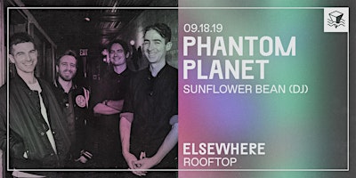 ☼ Performances└ Phantom Planet Doors: 6PMPerformances: 6PM - 10PMRoof deck closes at: 1AMIn an effort to discourage scalpers and give more real fans the opportunity to come to our events, Elsewhere operates an official venue ticket exchange, powered by Lyte. If you purchased a ticket but can no longer use it, please consider putting it back on the exchange for a full refund, allowing another fan to attend.Click here to head to the Lyte Ticket Exchange.---- ☼ About Elsewhere RooftopElsewhere Rooftop is a seasonal large outdoor bar and events space, offering a signature frozen drink menu, shows & parties, sunset DJ sessions, food pop-ups, film screenings, art happenings, and much more all summer. Full calendar at https://bit.ly/2UMjRb3 ☼ Hours*The Rooftop usually opens at 6PM Monday through Friday and 2PM Saturday & Sunday, but is only open when the following events are happening: https://bit.ly/2UMjRb3 — please do make sure to check the rooftop calendar before stopping by! ☼ Rain or Shine PolicyAll shows and events on the Rooftop are rain or shine! If the weather prevents us from carrying on, we will update customers via our website, Facebook, Instagram, Twitter, Eventbrite and Resident Advisor. ☼ Safer Space PolicyELSEWHERE MAINTAINS A STRICT ZERO TOLERANCE POLICY FOR HARASSMENTElsewhere is intended to be a safe space to enjoy music, art, expression, and free play. Our staff are trained to remove individuals engaging in any form of sexual harassment, acts of aggression (including leering), racism, misogyny, transphobia, homophobia, religious bigotry, or hatred and discrimination of any kind. If you see or experience any unwanted attention, contact, bullying, harassment, or behavior of any kind that makes you uncomfortable, please speak out and notify our staff immediately.Please read our full policy at: https://bit.ly/2VxByad