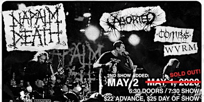 The legendary NAPALM DEATH play Vitus with Aborted, Tombs, and WVRM! 2nd night added by popular demand.