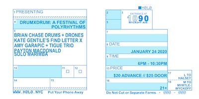 FULL LINE-UP:PAYTON MACDONALD SOLO MARIMBAAMY GARAPIC TIGUE TRIOKATE GENTILE’S FIND LETTER XBRIAN CHASE DRUMS + DRONES