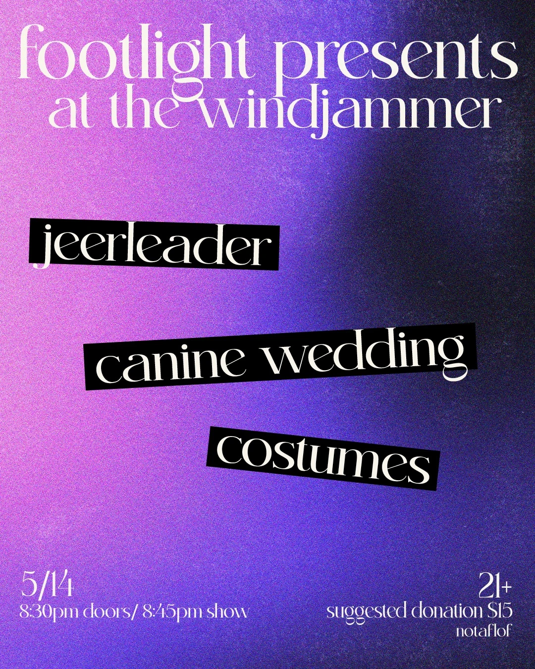 doors 8:30pm21+$15 suggested donationNOTAFLOF