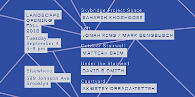 Elsewhere is pleased to present Landscape's Fall Opening showcasing six artists. Landscape, housed within Bushwick’s music venue Elsewhere, bridges the gap between visual art, music, and technology. Through installations, performances, commissions, and community events, Landscape builds on Elsewhere’s mission to place artists first, encouraging multi-disciplinary collaboration and experimentation. In an effort to create a sustainable platform the art program is funded by a portion of all Elsewhere tickets. By coming to a show or party at Elsewhere, our community is directly funding art commissions and installations.⟁ SEASON OPENING & EVENTS ⟁On September 4th curator Molly Surno opens the Fall Landscape program at Elsewhere. Six artists will kick off the season with a series of interventions throughout the building. Artists include:Bahareh Khoshooee in the SkybridgeJonah King in the loftMark Sengbusch in the loftMatteah Baim in the outdoor stairwellDavid B Smith under the stairwellAkwetey Orraca-Tetteh in the courtyardPlease sign up to our mailing list for future notifications and RSVP. LANDSCAPE LIST ➟ http://bit.ly/landscapesubscribe
