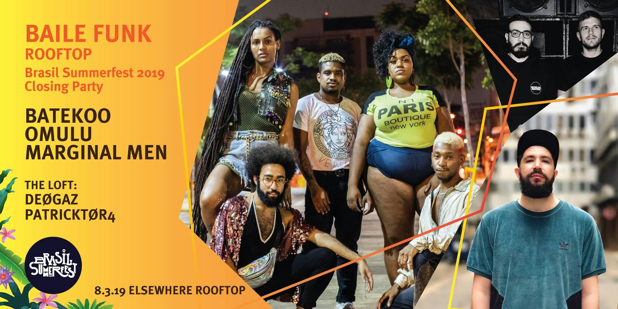 **This event will not accept the Saturdays + Sundays RSVP for free rooftop entry before 4pm listed on the Elsewhere websiteBrasil Summerfest: Baile Funk Rooftop Festival Closing PartyFestival closing party featuring baile funk’s hottest party collectives and genre bending DJs from Brazil. BATEKOOBATEKOO is the premiere LGBT, Afro-Centric party collective in Brazil. The collective was born in Salvador, Bahia in 2014 as a party made by black producers for the black marginalized community. Nowadays, it has a configuration of a movement that aims to increase value and promote black culture and its aesthetics. Since its creation, BATEKOO's goal is to empower urban youth all over Brazil, focusing on generating a safe space to all the minorities from the LGBT community. The vibe you'll find at a BATEKOO party is a mixture of urban Afro-American with Brazilian funk events that happen in the favelas. The DJ sets range from baile funk, trap, kuduro and hip hop. In 2018, BATEKOO was recognized as São Paulo’s best party by Folha de São Paulo, the country’s main newspaper. Red Bull documentary on BATEKOOwww.facebook.com/batekoo/https://soundcloud.com/batekooOMULURio de Janeiro producer and DJ Omulu aka Antonio Antmaper is one of the creators of Rasteirinha, a blend of funk carioca with reggaeton and axé. Ask him about Brazilian funk’s global success and he’ll tell you that he had something to do with it. “I feel a little responsible for this second baile funk world wave,” he says. “I first sent MC Bin Laden and Brinquedo songs to Diplo, and I think he introduced it to Skrillex, who made ‘Bololo Ha Ha’ known everywhere.” The rasterinha-bass-mestre continues to release dancefloor monsters and tour the world over. www.facebook.com/omulu/https://soundcloud.com/omuluMARGINAL MENThe Rio de Janeiro bass bandits Marginal Men have become synonymous with explosive DJ sets. The duo is made up of Gustavo Elsas and Pedro Fontes who were creators of Wobble, a party voted 'best party' by Rio 2014 Night Prize. Since then, Marginal Men has been performing festivals in Brazil and around the world, and releasing bass crushing productions with collaborators including MC Bin Laden, Branko, MC Toy, and many more.www.facebook.com/MarginalMen/https://soundcloud.com/marginal-menBoiler Room x Red Bull set::: In the Loft :::PATRICKTØR4Recifé based DJ and Radiomaker Patricktør4 is one of Brazil’s main underground DJs. His sets deconstruct the music of Brazil and that of the world. From northeastern Baião, African Kuduro to Carioca's baile funk, Latin Pará's Tecnobrega to Cumbia Digital, the result of these combinations makes his sets full of high energy.https://soundcloud.com/patricktor4https://www.facebook.com/djpatricktor4/DEØGAZDJ and production duo Gaspar Muniz and Deo Jorge have been working the decks behind clubs like Output and Le Bain and have garnered fame with their Onda party during Rio de Janeiro carnival. Ready to release an EP of Brazilian edits, Deøgaz mixes deep tropical cuts and Afro-diasporic rhythms. ABOUT BRASIL SUMMERFESTBrasil Summerfest is the country’s premier contemporary Brazilian music & arts festival showcasing some of the country's most dynamic artists, as well as film screenings, art displays, talks and special events that celebrate the diverse cultural offerings of Brazil. This event is the festival’s 2019 closing party.www.brasilsummerfest.com