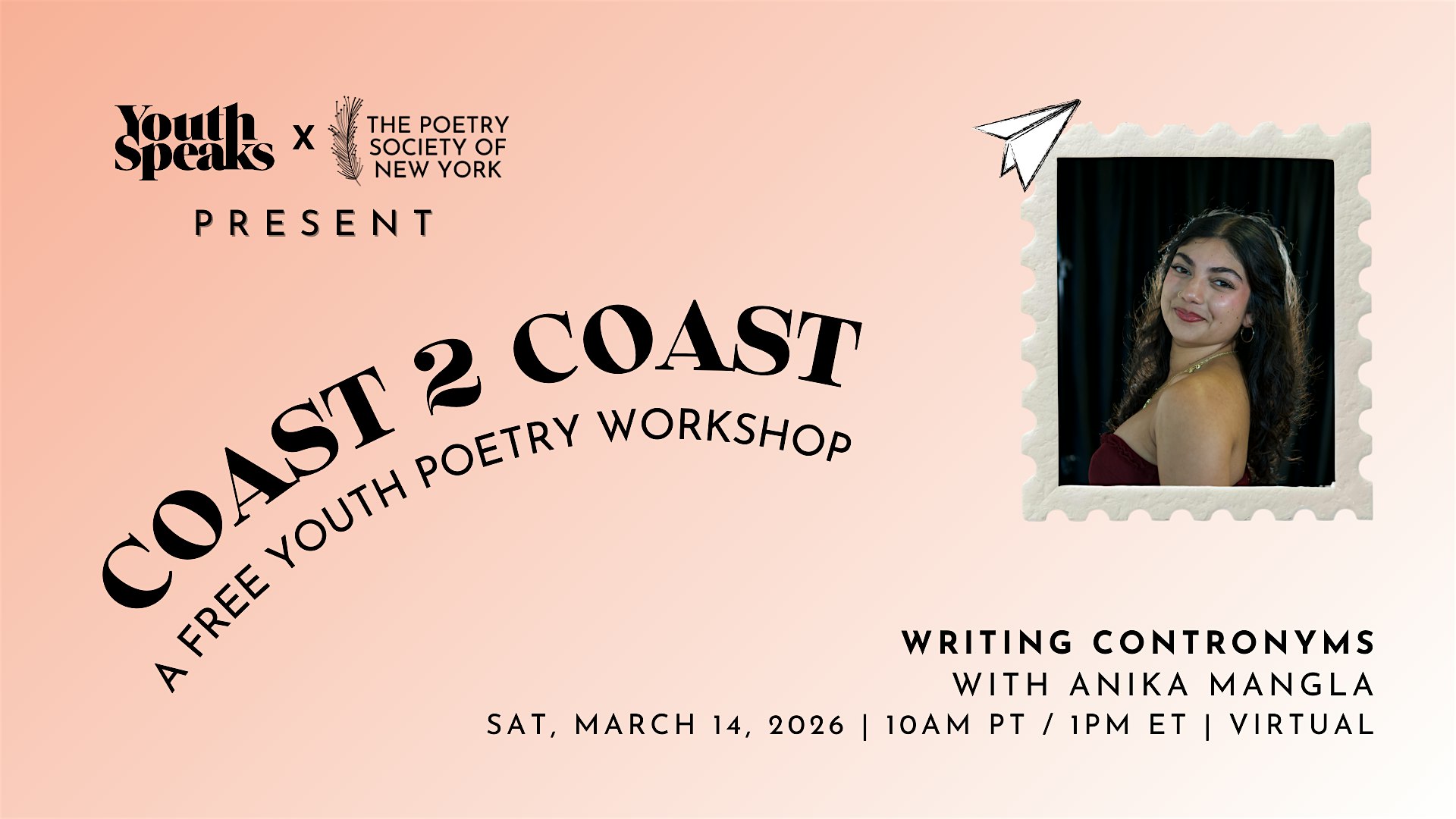 Join The Poetry Society of New York & Youth Speaks for a free, virtual, generative poetry workshop by youth for youth, with Anika Mangla!