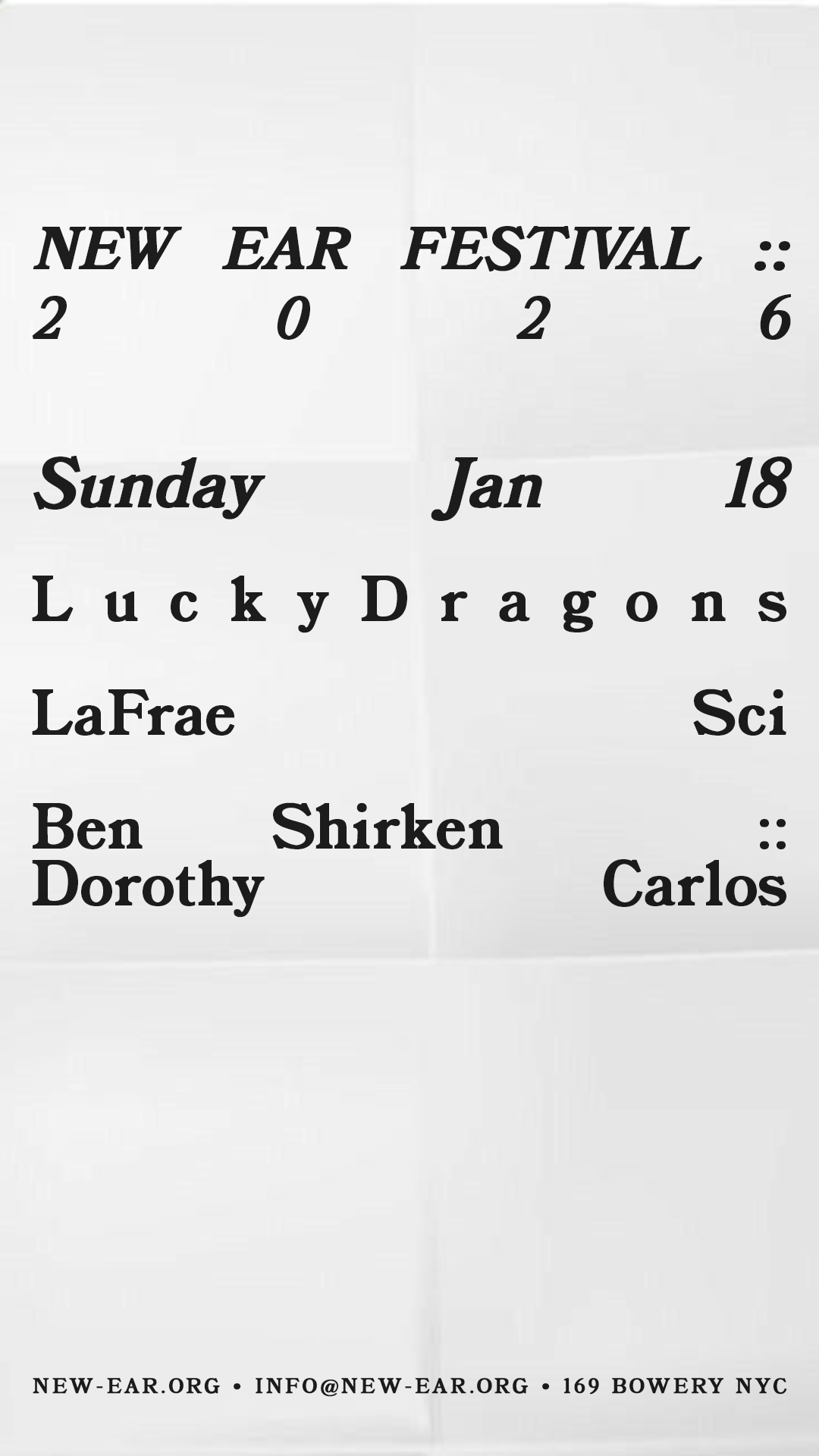 The annual New Ear Festival fulfills one of New Ear Inc.’s core missions—to help restore creative, experimental spirit on the ground floor level of downtown Manhattan. The festival showcases time-based art in all its forms—from sound installations and video screenings to storytelling and physical movement.