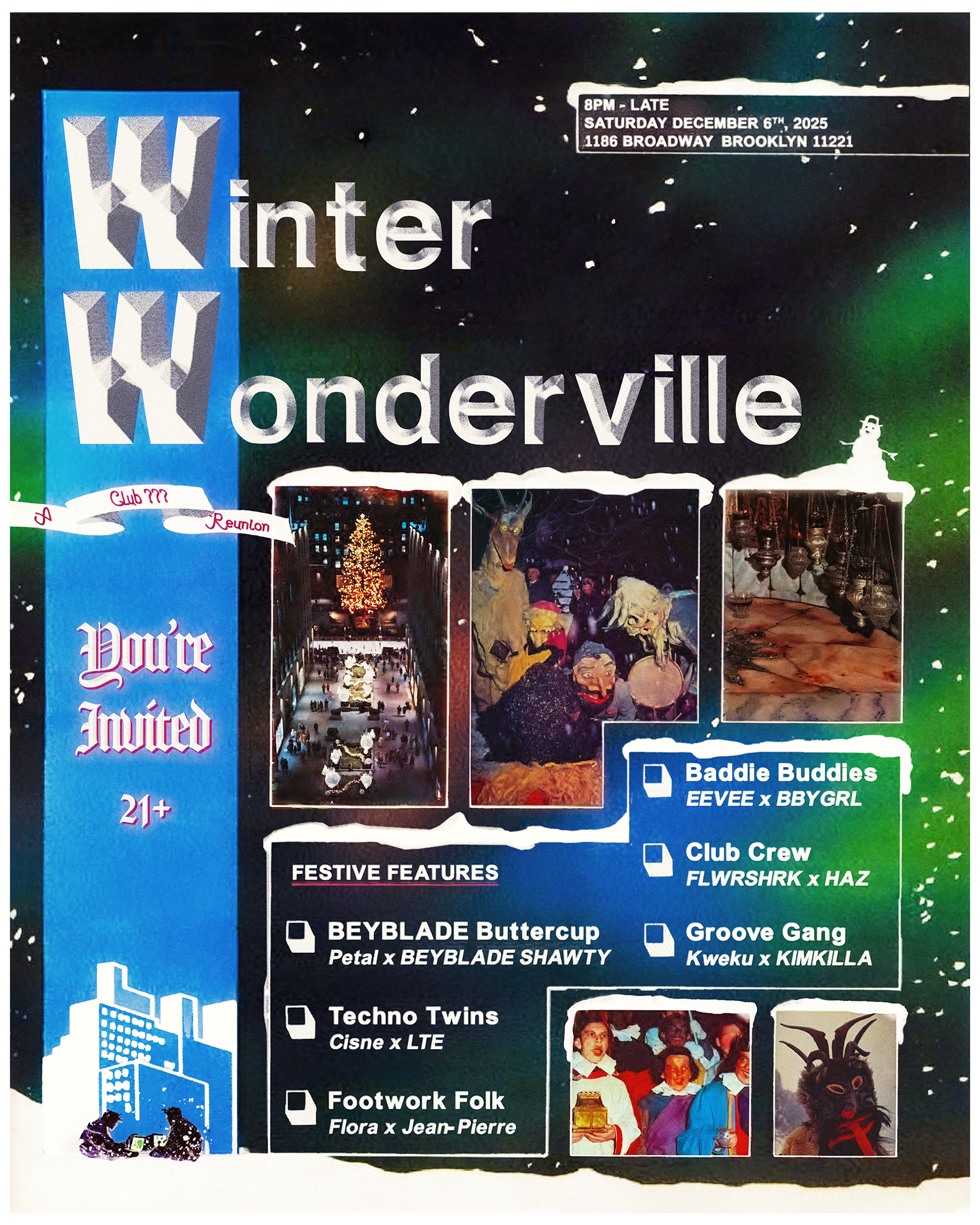 Hear ye, hear ye! Join us in the arcade for a Club: ??? family affair as we bring in the celebrate the holidays with your favorite DJs from the year of Club: ??? matched up with one another to create the ultimate B2B blowout bash. Per usual, expect anything and everything from the lineup sonically, and come ready to dance all night at the Winter Wonderville.