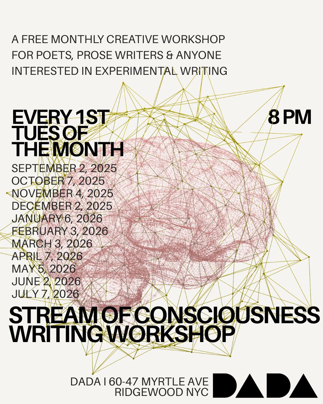 Join us on the 1st Tuesday of every month for a FREE in person creative writing workshop exploring the art of "stream of consciousness writing" at DADA NYC. This is a guided writing exercise in a bar setting. Writers are encouraged to first get comfortable, relax, take a walk in Dada's backyard and find their favorite seat. The writing process will be explained by the instructor, and prompts will be given throughout the 1 1/2- 2 hrs writing workshop. Participants are free to move, leave and reenter as they wish. All participants are encouraged to stay on to write beyond the hours of the guided workshop for as long as they would like to continue writing (2 am cut off time!)
