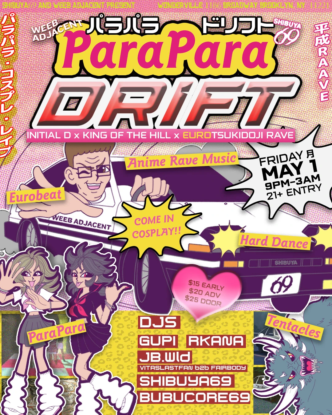 @shibuya69 and @weeb.adjacent are bringing you PARA PARA DRIFT: AN INITIAL D x KING OF THE HILL x UROTSUKIDOJI PARA PARA RAVE!! It’s the end of the 3000 year old cycle, and the OVERFIEND has revived for a night of eurobeat jams!!!!!