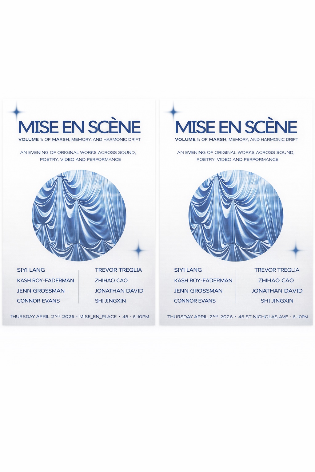MISE EN SCÉNE is a performance showcase hosted at MISE-EN-PLACE, aiming to create a shared platform and emerging network for experimental practices that don’t always fit neatly within departmental silos; from composition and sonic arts to performance, installation and visual media, and other hybrid forms. The event’s primary intention is to bring people together across different practices and create an ongoing platform for dialogue, overlap, and future collaboration.