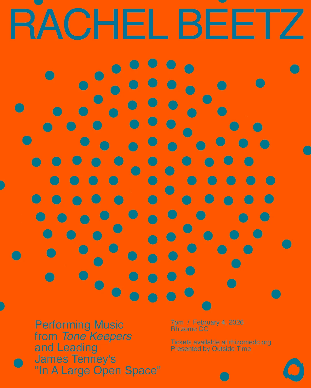 The evening will culminate with Rachel leading a performance of James Tenney's "In A Large Open Space," scored for "any 12 or more sustaining instruments." The audience will be invited to move freely among the musicians, who will be spread throughout Rhizome. Performers will be drawn from throughout the DMV's vibrant experimental music communities.