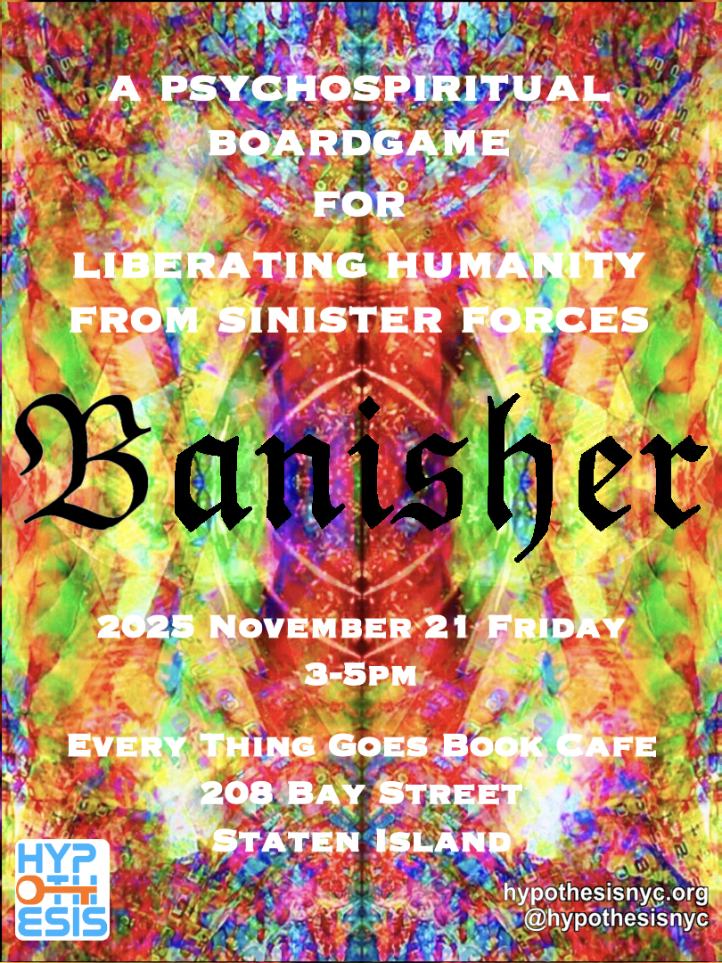 Banisher, a creation of Hypothesis, is a psycho-spiritual table-top board game for liberating humanity from sinister forces. One of the game designers, Joe Quinn, will be guiding us through the experience. Joe describes himself as an underground video and performance artist, a mathematician, a curriculum designer and a teacher.