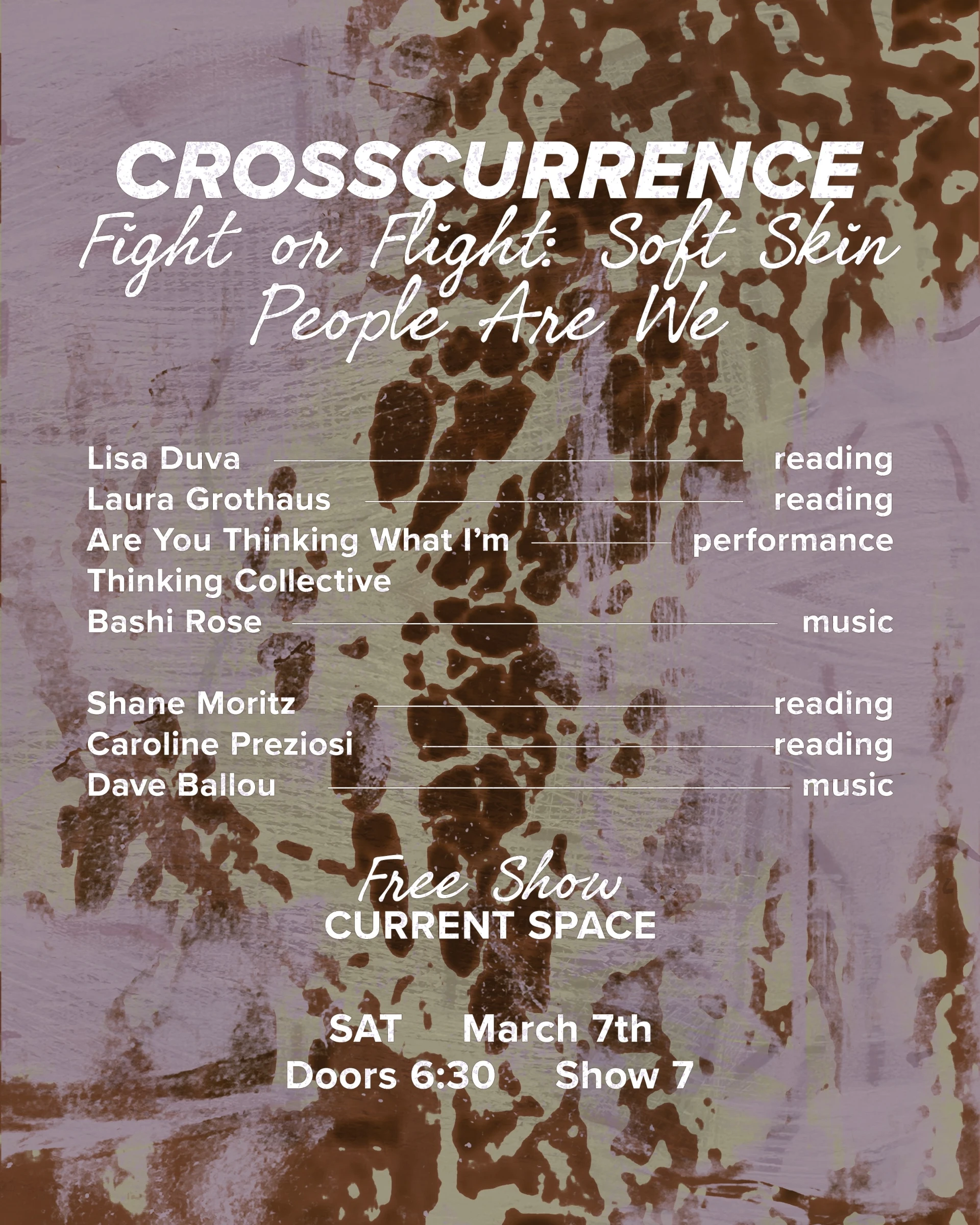 Crosscurrence is a night of readings, music and performance curated by Andrew Shenker. This series occurs roughly every 6 weeks and each one is centered around a theme.
