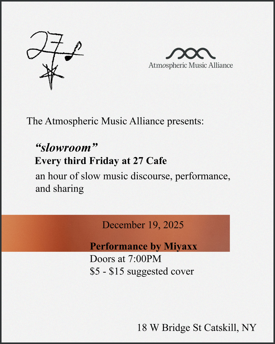 The Atmospheric Music Alliance presents “slowroom,” an hour of slow music discourse, performance, and sharing every third Friday at 27 Cafe.