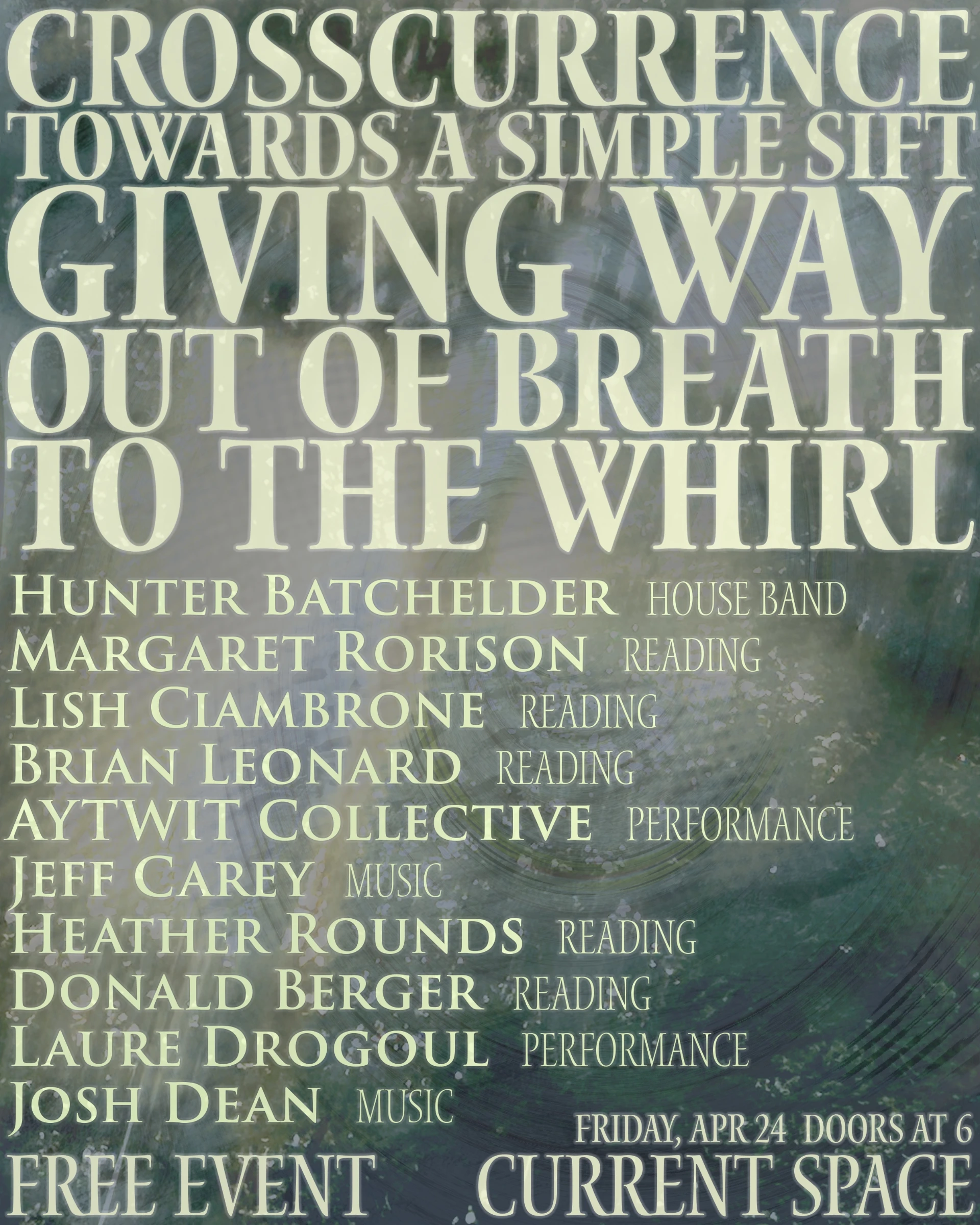 Crosscurrence is a night of readings, music and performance curated by Andrew Shenker. This series occurs roughly every 6 weeks and each one is centered around a theme.