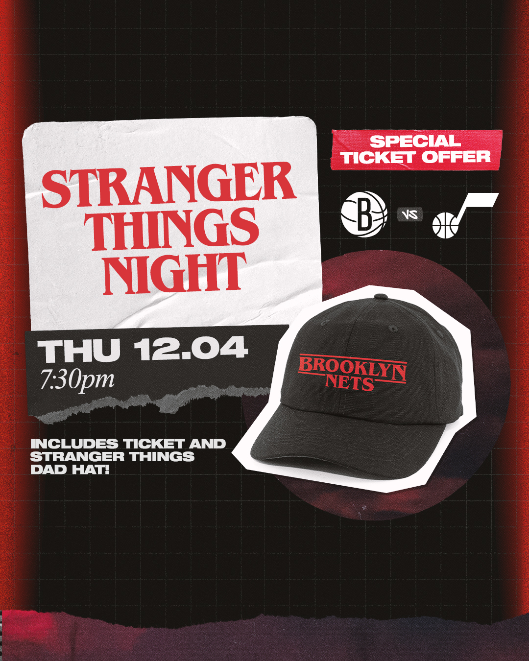 Secure your group tickets now and get the best seats before they disappear into the Upside Down! Each ticket purchased includes a co-branded Brooklyn Nets & Stranger Things hat that is limited to this night only!!