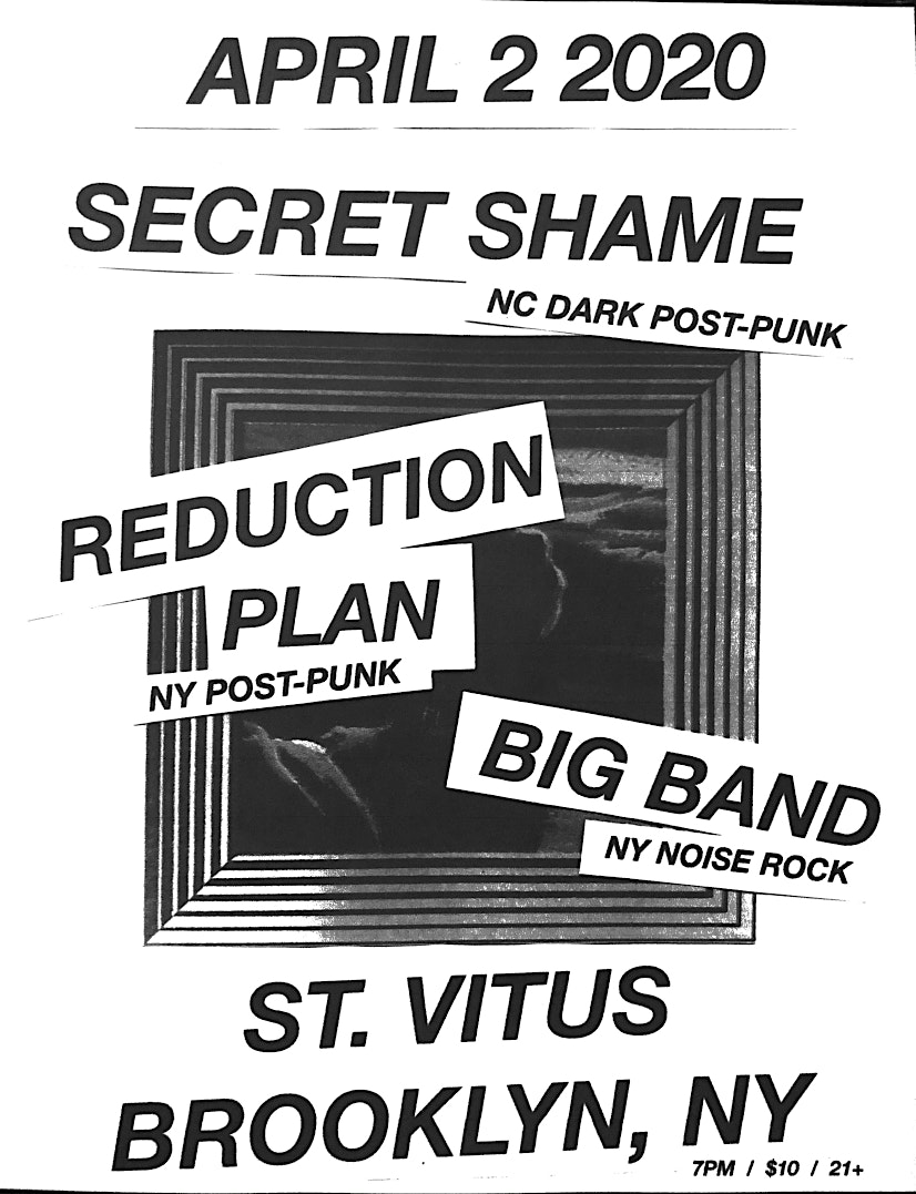 NC dark post-punk outfit Secret Shame are in town! With Reduction Plan & Big Band. C'mon out!