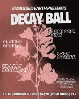 For one night only, Embodied Earth presents DECAY BALL, a benefit concert to support our next year of environmental arts programming. Featuring New York's best acts, don't miss this unforgettable night of music and dancing.