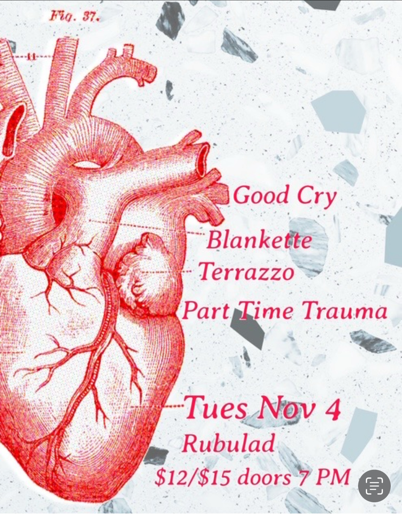 Terrazzo is Bri Barte, Pete Johnson, Matthew Weddig, Nico Dona Dalle Rose, Gowanus Canal, a terrace, many small rocks, dog walks, humble pie, a band, and a floor finish. This is their debut show.