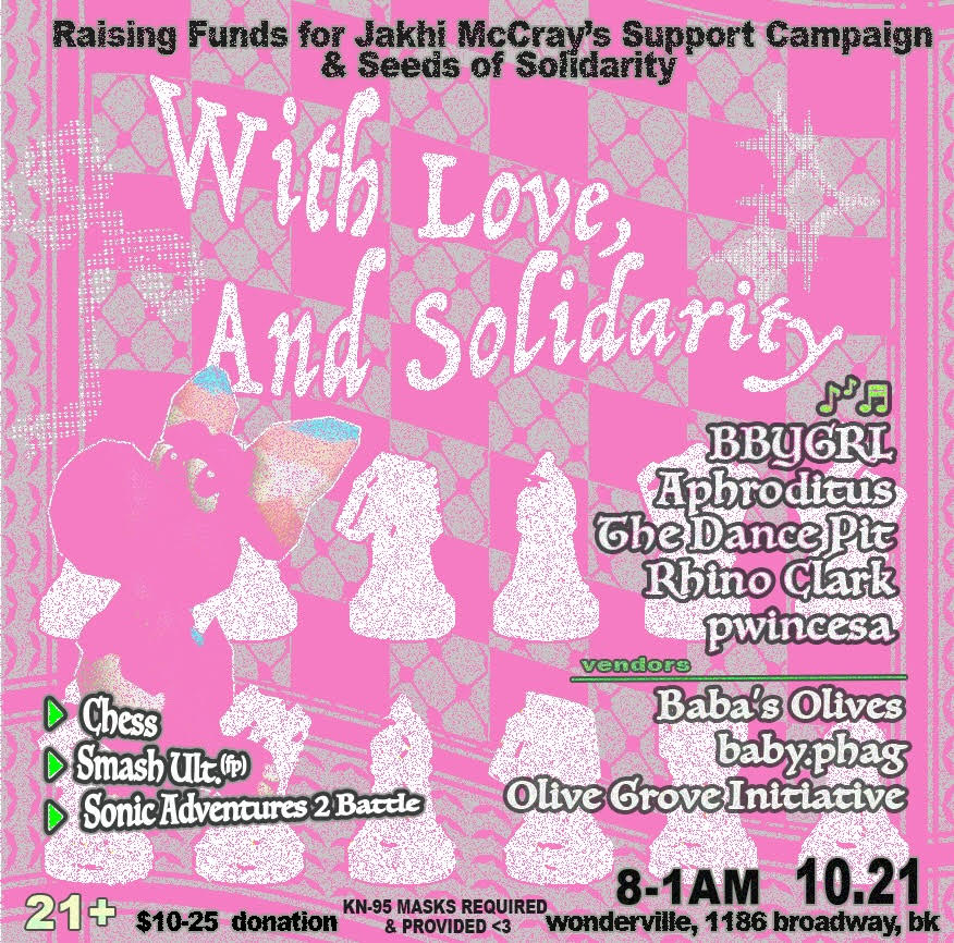 Join us Tuesday 10/21 8pm-1am at Wonderville to raise funds for Seeds of Solidarity (farmers in Sudan and Palestine) and Jakhi McCray’s Support Campaign. $10-25 suggested donation, KN-95 masks required and provided.