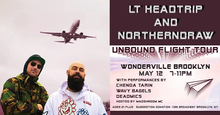 Lt Headtrip and NorthernDraw bring the Unbound Flight Tour to Brooklyn with a powerful live performance fueled by off kilter yet thoughtful lyricism and energetic crate digger beats. The partnership forged in DIY venues, punk rock practice spaces, and local record shops in Portland, OR, now spans the globe, with Headtrip (DC area) and Draw (Munich) inviting vocalists from Sweden, West Africa, Venezuela, Cairo and beyond into their series of EPs. Headtrip, a longtime mainstay in the NYC art rap scene, has collaborated with underground favorites such as billy woods, Quelle Chris, ELUCID, Blockhead and Rob Sonic. Their new EP, Unbound Flight, is available now everywhere.