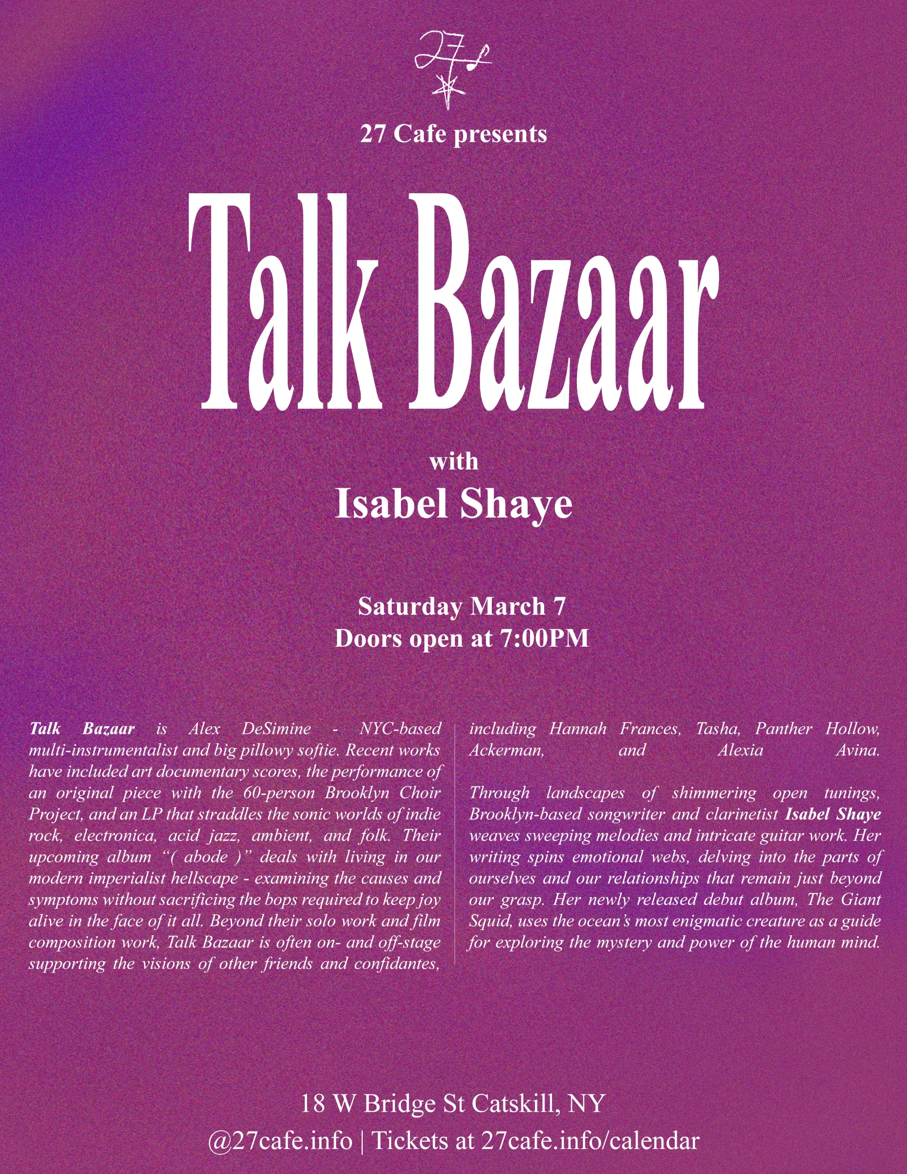 Talk Bazaar is Alex DeSimine - NYC-based multi-instrumentalist and big pillowy softie. Recent works have included art documentary scores, the performance of an original piece with the 60-person Brooklyn Choir Project, and an LP that straddles the sonic worlds of indie rock, electronica, acid jazz, ambient, and folk. Their upcoming album “( abode )” deals with living in our modern imperialist hellscape - examining the causes and symptoms without sacrificing the bops required to keep joy alive in the face of it all. Beyond their solo work and film composition work, Talk Bazaar is often on- and off-stage supporting the visions of other friends and confidantes, including Hannah Frances, Tasha, Panther Hollow, Ackerman, and Alexia Avina.
