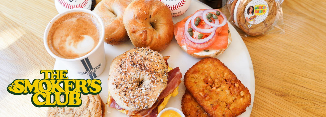 Smoked Bacon, Egg + Cheese OR Smoked Salmon, Cream Cheese, Hot Sauce, Capers, Purple Onions