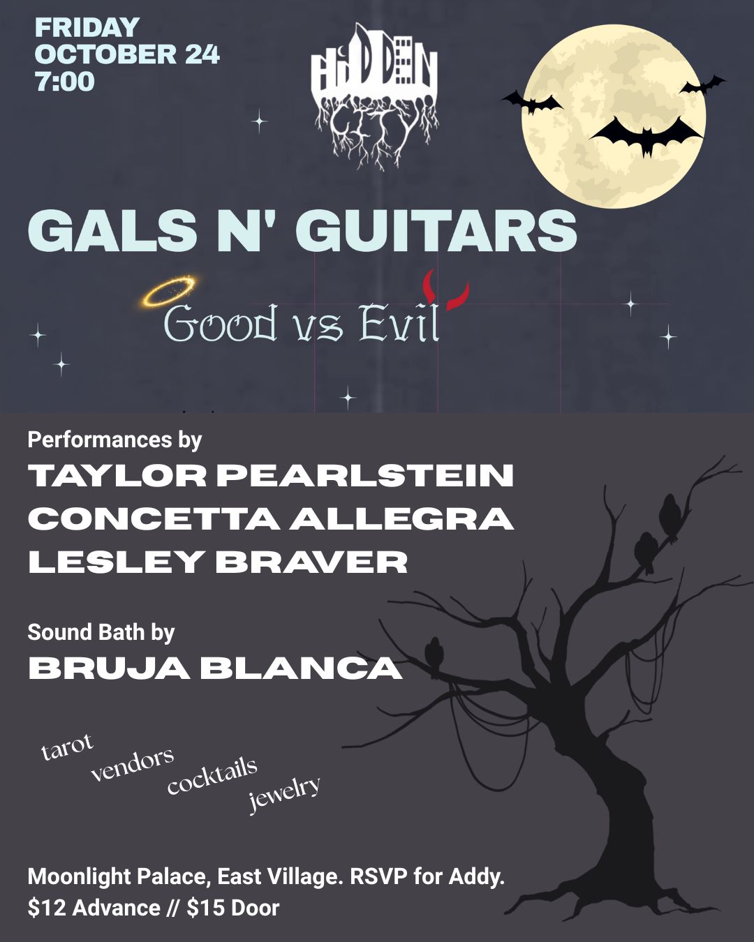 Welcome to Gals n Guitars: Good vs. Evil, presented by Hidden City and located in the Moonlight Palace, a DIY apartment venue in the East Village.
