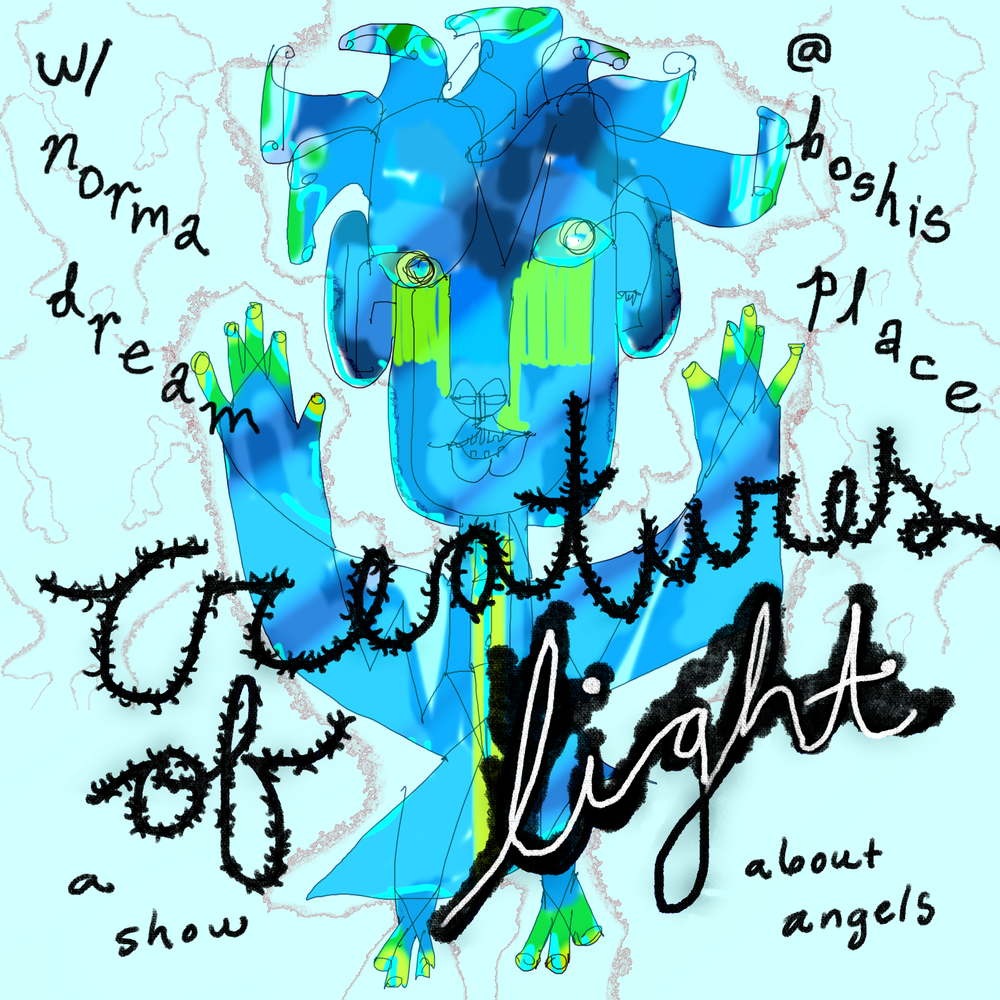 come touch and be touched by an assortment of angelic beings. angel flavored, angel misted, angel printed, angel fitted--bring angels, be the angels in the room with us. the angels will be in the computer, the angels will push little toy instruments into your hands. clown angel, singing angel, rapping angel, feedback angel, skating angel, dream angel. DIVINE AND DREADFUL CRYPTIDS IF LIGHT!!!