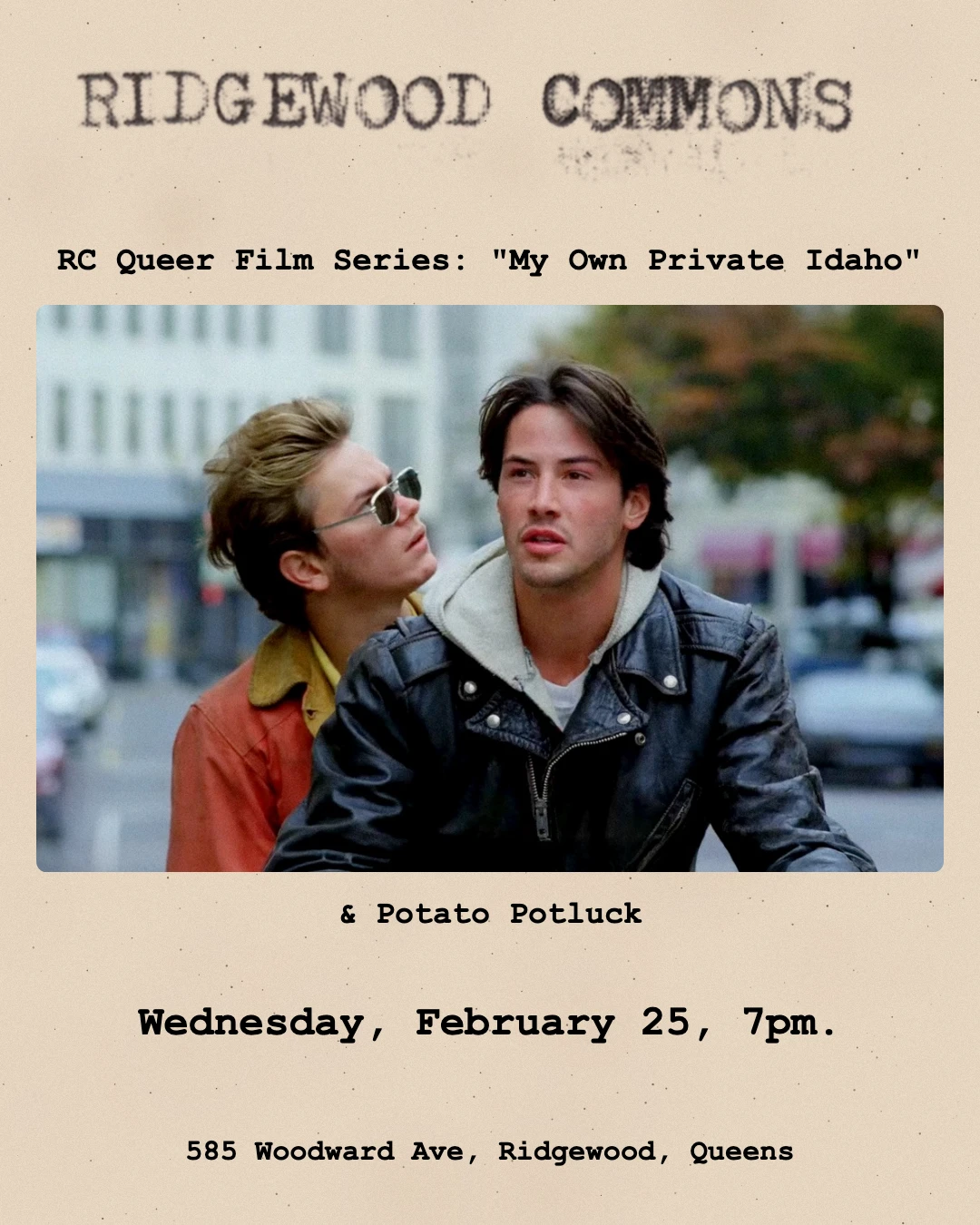Like potatoes? Well, we're gonna have a lot of 'em! This Wednesday 2/25 at 7pm, come to Ridgewood Commons for our first ever potato potluck, then stay for a screening of the queer classic, My Own Private Idaho (1991).