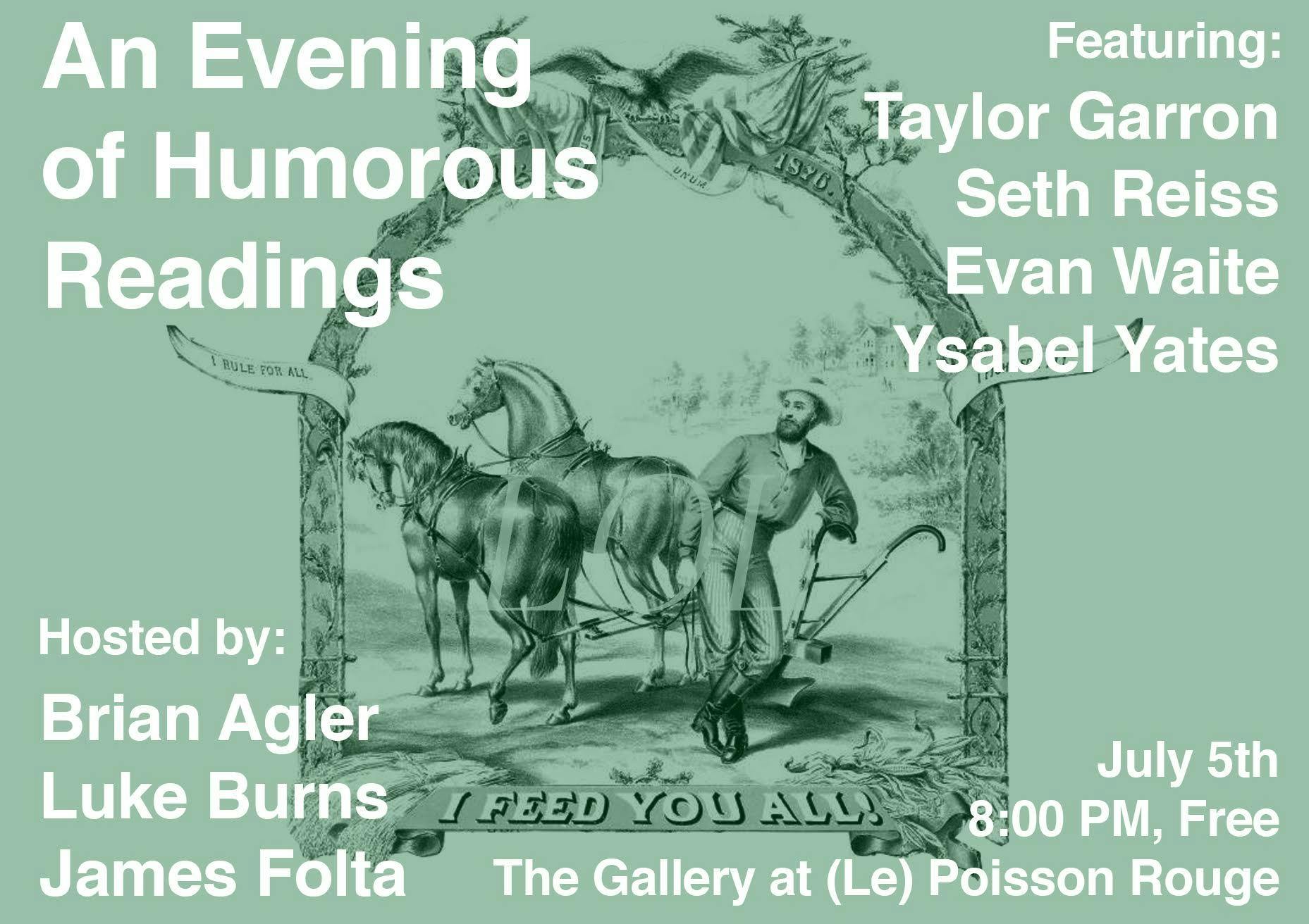 An Evening of Humorous Readings is a monthly show of literary humorists reading their most literary humor! We feature short humor pieces, like the kind you find on McSweeney’s or Shouts and Murmurs, read aloud by the people who wrote them. An Evening of Humorous Readings has featured writers from Saturday Night Live, Late Night with Seth Meyers, The Onion, and more.Plus, it’s free, and you can buy beers!