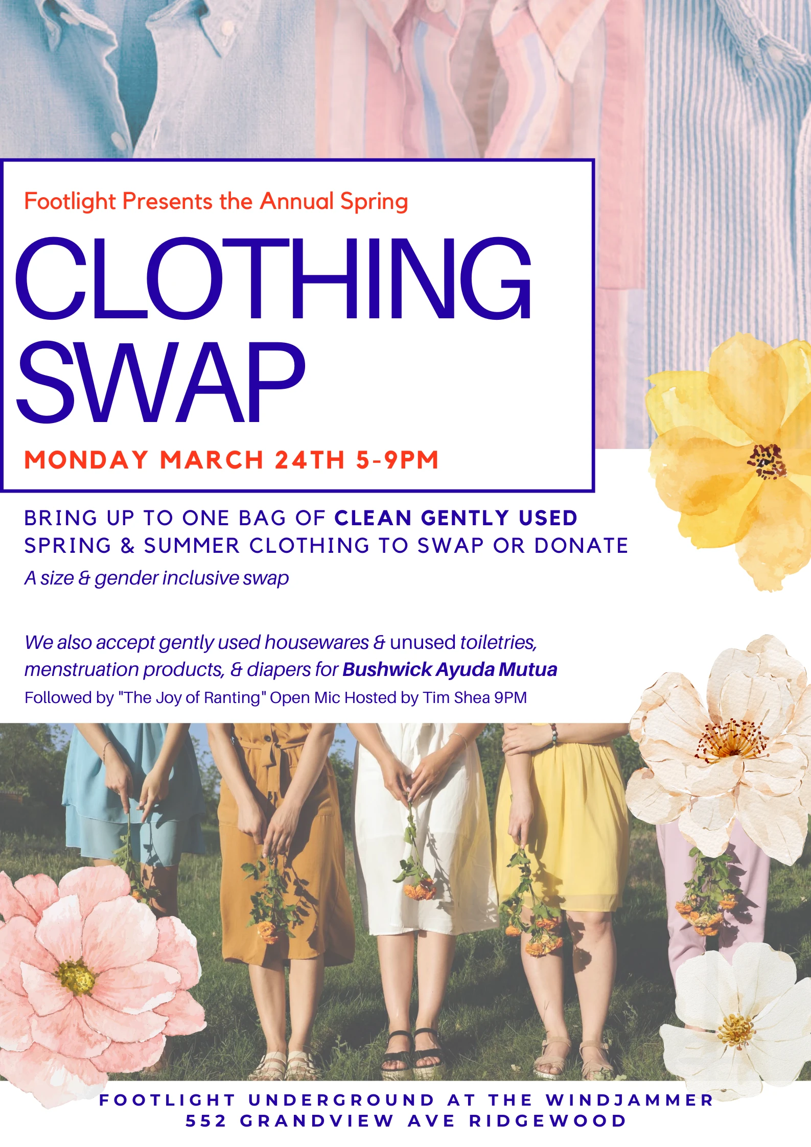 It's getting nicer outside, and we're ready to swap all your gently used clean clothing and home goods. All proceeds that do not get taken will be donated to Bushwick Ayuda Mutua.