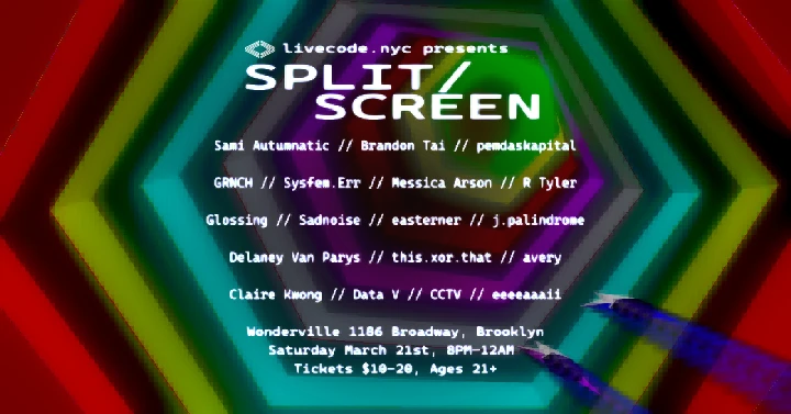 livecode.nyc presents SPLIT/SCREEN, an algorave inspired by multiplayer videogames, where livecoding meets co-op mode and vs. showdowns. Come through to see head-to-head and collaborative AV sets with Strudel, Orca, Hydra, modular synths, PS1 glitching, and more!