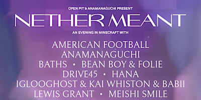 Open Pit & Anamanaguchi PresentN E T H E R M E A N TAn Evening in Minecraft withAmerican FootballAnamanaguchiBathsBEAN BOY & FOLIEDrive45HANAIGLOOGHOST & Kai Whiston & BABiiLewis GrantMeishi SmileNebita & aturaonlytomPlanet 1999ROBIN & MURDER CLUBsix impalaSkylar SpenceWAVEDASHY2K & SLEEPYCATTBenefit for Good360 Covid-19 ReliefFREE ➫ Streaming and Minecraft server instructions on http://elsewither.clubElsewither is a new virtual venue from Open Pit and Elsewhere