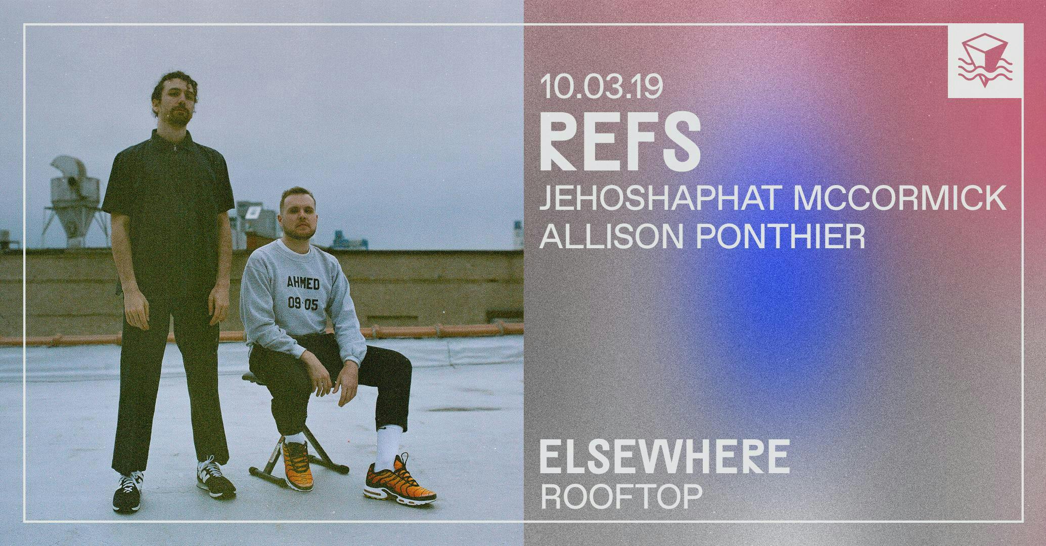☼ Performances└ Refs└└ Jonah Mutono└└└ Allison Ponthie Doors: 6PMPerformances: 6PM - 10PMRoof deck closes at: 2AMDue to inclement weather, the REFS show on 9/12 has been rescheduled to 10/3. All other details will remain unchanged. All tickets will be honored at the rescheduled show. Tickets will be refunded through point of purchase upon request. Please request refunds for your tickets via Eventbrite if you cannot make it to the rescheduled date.---- ☼ About Elsewhere RooftopElsewhere Rooftop is a seasonal large outdoor bar and events space, offering a signature frozen drink menu, shows & parties, sunset DJ sessions, food pop-ups, film screenings, art happenings, and much more all summer. Full calendar at https://bit.ly/2UMjRb3 ☼ Hours*The Rooftop usually opens at 6PM Monday through Friday and 2PM Saturday & Sunday, but is only open when the following events are happening: https://bit.ly/2UMjRb3 — please do make sure to check the rooftop calendar before stopping by!☼ Rain or Shine PolicyAll shows and events on the Rooftop are rain or shine! If the weather prevents us from carrying on, we will update customers via our website, Facebook, Instagram, Twitter, Eventbrite and Resident Advisor. ☼ Safer Space PolicyELSEWHERE MAINTAINS A STRICT ZERO TOLERANCE POLICY FOR HARASSMENTElsewhere is intended to be a safe space to enjoy music, art, expression, and free play. Our staff are trained to remove individuals engaging in any form of sexual harassment, acts of aggression (including leering), racism, misogyny, transphobia, homophobia, religious bigotry, or hatred and discrimination of any kind. If you see or experience any unwanted attention, contact, bullying, harassment, or behavior of any kind that makes you uncomfortable, please speak out and notify our staff immediately.Please read our full policy at: https://bit.ly/2VxByad