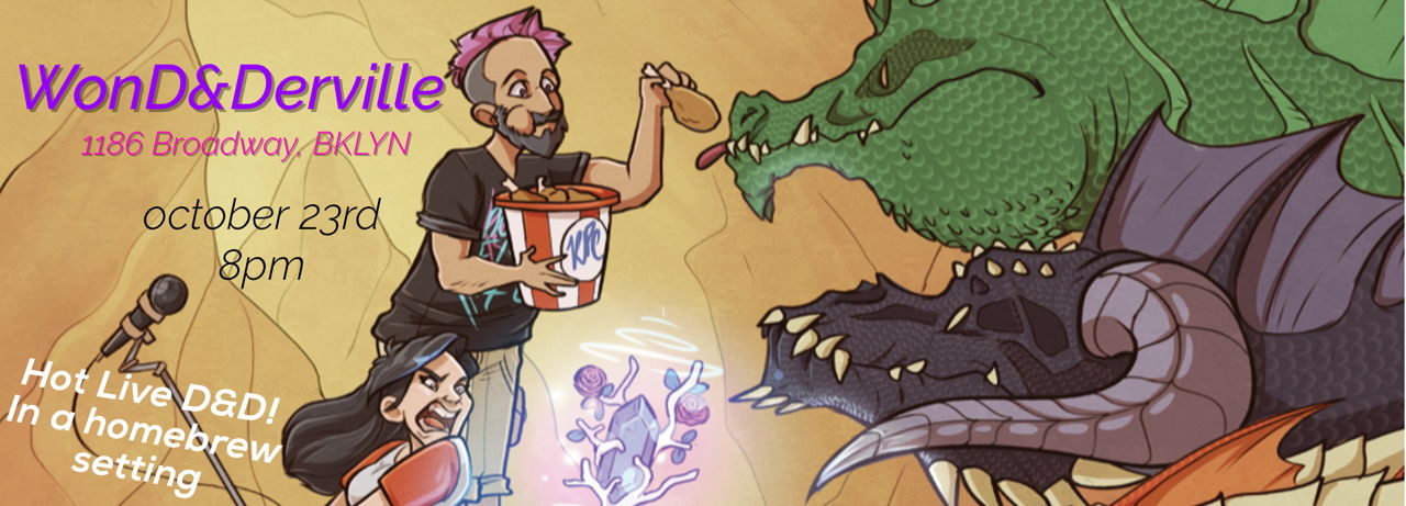 An interactive gaming and storytelling show. Come play D&D at Wonderville. Bring your own 5e character sheet or roll one up at the table and adventure in the made up city of Pektgraktshevolnornum \[Pitsberg\]. Players and GMs are encouraged to bring their own stories and locales to the game to be incorporated into the story. "Once it's on stage it's canon"