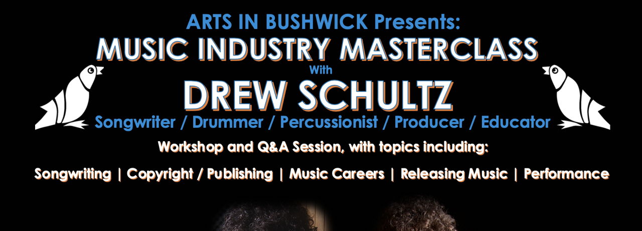 Advances in recording and production technology have allowed for wider access to music creation than ever before. With the advent of home recording apps/software and devices, anyone can make their musical ideas a reality. Arts in Bushwick invites you to join Drew Schultz for a workshop on how to take the next steps towards writing, producing, and performing at a professional level – learn about songwriting, production, copyright/publishing, live performance, releasing music, branding, careers in music, and how to use your creativity as a professional launching pad.