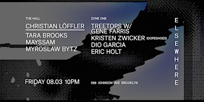 10PM - 5AMHALL└ Christian Löffler└ └ Tara Brooks└└└ Mayssam└└└└ Myroslaw BytzZONE ONE└ Kristen Zwicker (dopeshoes)└└ Dio Garcia└└└ Eric Holt--heads up y'all: this summer season, the Elsewhere Rooftop will be open all night on weekends space-permitting, so grab a frozen drink with a view of the skyline when you need a breather! if you've never been to our space, there is lots else to explore too! our parties are multi-room celebrations, featuring a very large cavernous warehouse hall and a cozy dance floor in the side room, plus a small hideaway lounge tucked into the 2nd floor. make sure to wander!