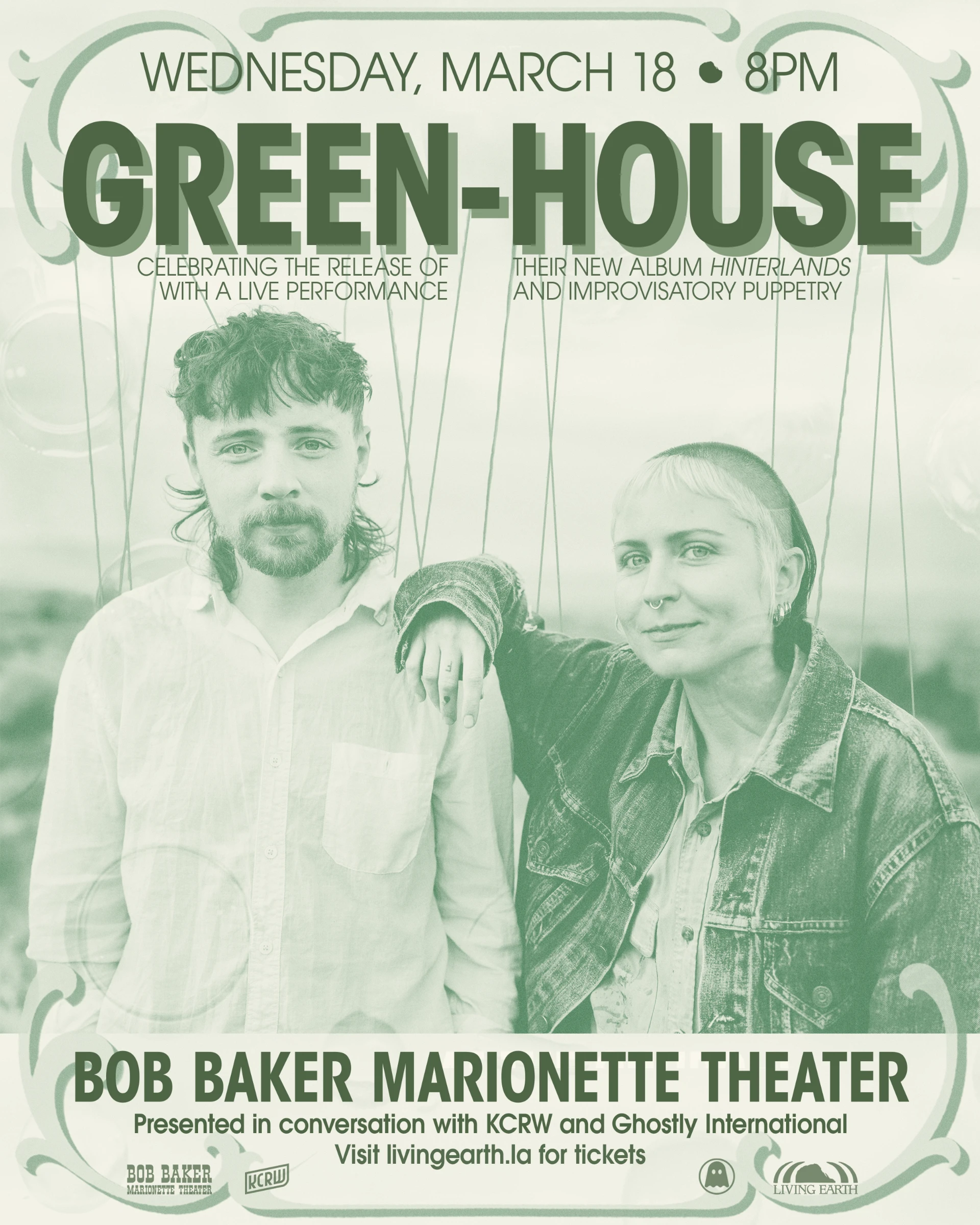 Arrive early for tea, a pre-concert preview of Hooray LA!, and to be the first to bring home a copy of Hinterlands. Enormous love to Green-House for trusting us with their album release show, the Bob Baker Marionette Theater for always welcoming Living Earth with the most welcoming arms, to Ghostly for bringing this music and so many records that we love into the world, and to KCRW music for spinning selections from the record live on air and spreading the good word on what we’re up to all over LA.