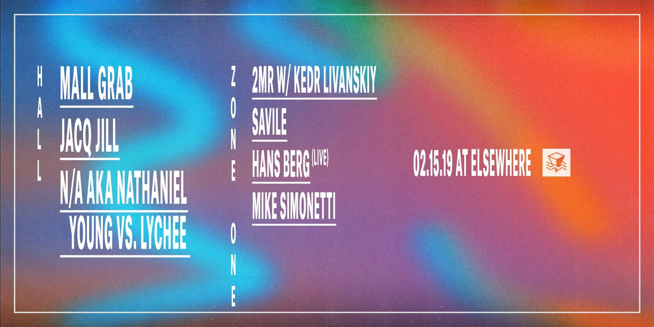 Mall Grab, Jacq Jill & N/A aka Nathaniel Young vs. Lychee + 2MR w/ Kedr Livanskiy, Savile, Hans Berg (live), Mike Simonetti, Let's Play House w/ St. David & Jacques Renault @ Elsewhere