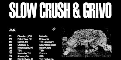 TONIGHT! Bar opens at 6. Doors at 7. Tickets available at doors. Set times: 8 Hypoluxo 845 Suburban Living 930 Grivo 1030 SLOW CRUSH